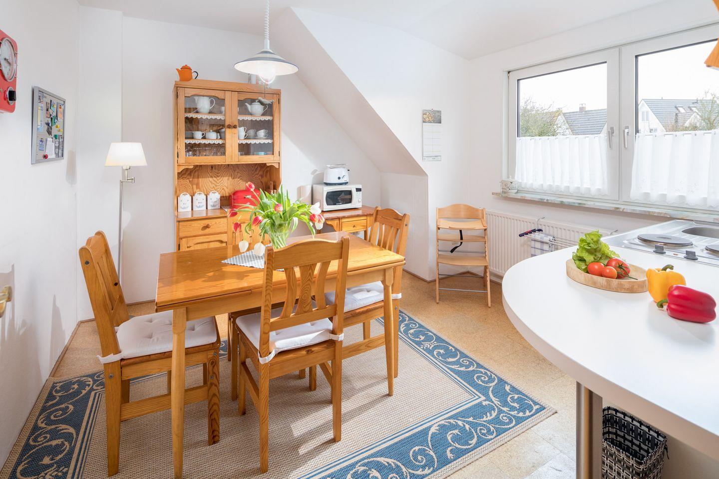 Die Ferienwohnung „Himmelsrichtung“ befindet sich im ersten Obergeschoss eines Einfamilienhauses. Sie liegt direkt an der Kuranlage „Napoleonschanze“ mit dem Schwanenteich. Einkaufsmöglichkeiten finden Sie direkt „um die Ecke“. Ganz in der Nähe können sich Ihre Kinder im Innen- und Außenbereich vom Spielplatz „Kap Hoorn“ austoben. 2016 wurde der Spielplatz "Am Kap" neu gestaltet und bietet nun für Jung und Alt Möglichkeiten für körperliche Aktivitäten. Am Polderteich ist eine Senioren Fitnessanlage neu entstanden. Zum Nordbadestrand gelangen sie auf einem ca. 10- 15minütigen Fußweg, in die Innenstadt mit ihren zahlreichen Restaurants und interessanten Läden ebenfalls in ca. 10 Minuten. Für weitere Ausflüge können sie in 5 Minuten zum Busbahnhof gelangen und mit dem Bus in den Inselosten fahren.