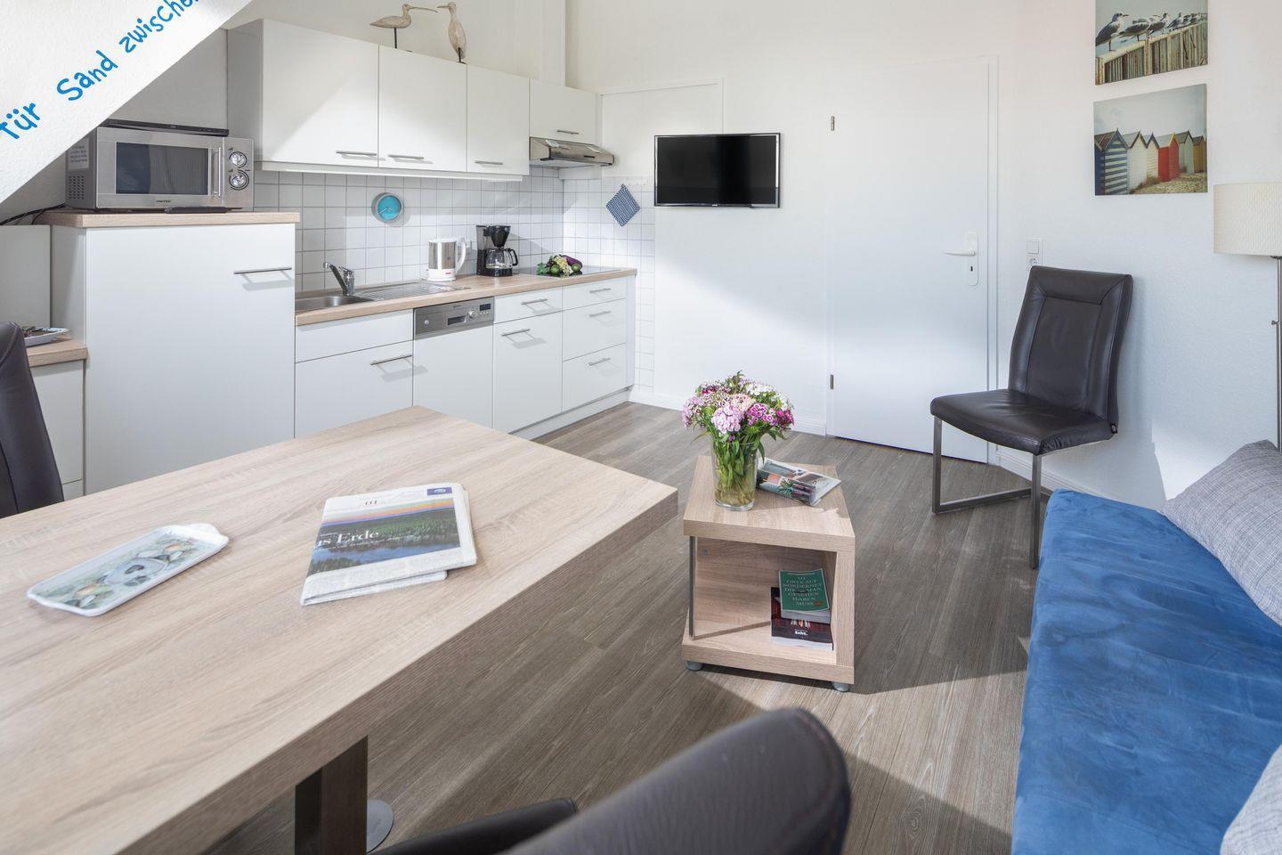 Diese helle und gut geschnittene 2-Zimmer-Ferienwohnung liegt in einer wunderschönen Jugendstil-Villa im Zentrum von Norderney. Kurplatz und Badehaus, Supermarkt, Bäcker sowie Restaurants liegen direkt um die Ecke. Und bis zum Strand sind es gerade einmal 300 Meter. Die Wohnung liegt im 2. Stock der liebevoll restaurierten Villa – das ist das Dachgeschoss, so dass Sie über sich nur noch das gut gedämmte Dach und die Möwen haben. Früher konnte man vom Schlafzimmer aus ein kleines Stück Nordsee sehen - daher heißt diese Wohnung "Seeblick". Mittlerweile ist diese Lücke zugebaut worden. Aber von allen Fenstern aus haben Sie einen traumhaften Blick über die Dächer der Innenstadt. Die gesamte Wohnung wurde im Frühsommer 2016 komplett hochwertig neu eingerichtet, es gab neue Böden und einen frischen Anstrich. So erwartet Sie ein schicker und moderner Wohnstandard. Dazu kommen die bis zu 3,60 m hohen Räume und die gemütlichen Dachschrägen – hier werden Sie sich bestimmt sofort wohl fühlen! Die Küchenzeile ist im Wohnraum integriert und mit Geschirrspüler, Ceran Kochfeld, Dunstabzugshaube, Toaster, Kaffeemaschine und Wasserkocher sehr gut bestückt. Eine Mikrowelle mit Grillfunktion steht ebenfalls zur Verfügung. Im Schlafzimmer finden Sie ein großes Doppelbett und den geräumigen Kleiderschrank. Im gemütlichen Wohnzimmer lässt sich die Couch zu einem bequemen 1,60 m breiten Bett umwandeln. Der Esstisch bietet bequem Platz für 4 Personen. Das moderne Bad hat viele Ablagemöglichkeiten und eine große Dusche. Der großzügige Flur bietet Platz für viele Schuhe und Jacken. Ein Kabel-TV und eine kleine CD-Anlage sind vorhanden. WLan ist für unsere Gäste natürlich kostenlos verfügbar. Viele kleine Extras sorgen dafür, dass unsere Gäste sich wie zuhause fühlen und gerne wieder kommen. So gibt es z.B. diverse DVDs und CDs für unsere Gäste – falls das Wetter mal den berühmten „Norderneyer Seenebel“ bringt. Im Haus befinden sich eine Waschmaschine und ein Trockner, die gegen Gebühr genutzt werden können. Eine kleine Bücherecke in der Diele des Hauses hilft aus, wenn die eigene Urlaubslektüre ausgelesen ist. Viele Stammkunden buchen von Jahr zu Jahr direkt wieder - das spricht für die gute Ausstattung und Pflege der Wohnung. Die traumhafte Lage, ruhig und doch sehr zentral, wird Sie begeistern! Haustiere bitte auf Anfrage. Die Wohnung ist nach DTV-Klassifizierung bewertet und mit 3 Sternen ausgezeichnet.