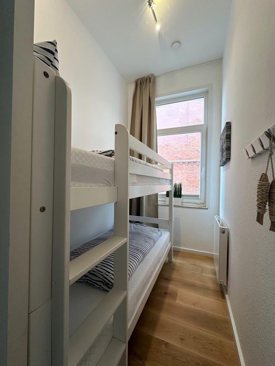 Die Wohnung verfügt über einen Wohnraum mit offener Küchenzeile. Die moderne Einbauküche ist voll ausgestattet mit einer Kaffeemaschine (Filter), einem Wasserkocher, einem Toaster, einer Mikrowelle sowie einem Ceranfeld mit vier Platten und einer praktischen Spülmaschine. Ein Kühlschrank mit Eisfach vervollständigt die Küchenausstattung. Das große Schlafzimmer verfügt über ein Doppelbett. Für die jüngeren Gäste steht ein kleines Zimmer mit einem Etagenbett bereit, welches speziell für Kinder konzipiert wurde und nicht für Erwachsene geeignet ist. Das Bad ist modern eingerichtet und bietet eine Dusche sowie ein WC. Die Einrichtung der Wohnung zeichnet sich durch hohe Decken, durch Echtholzparkett, durch eine moderne Einbauküche und durch einige maritime Dekorationen aus.