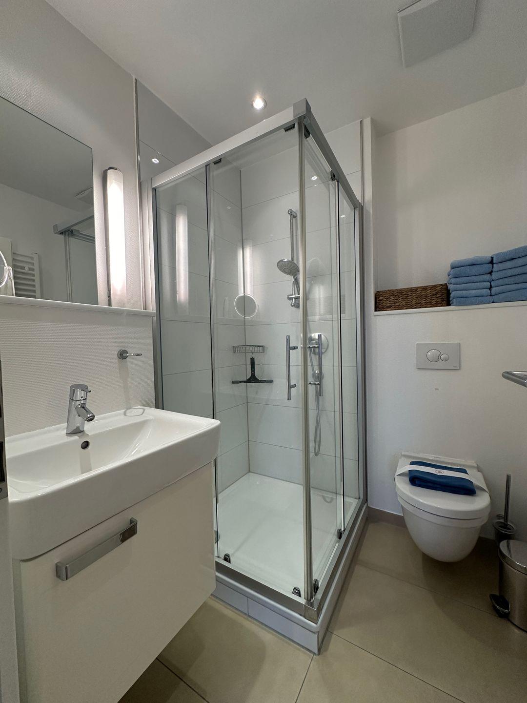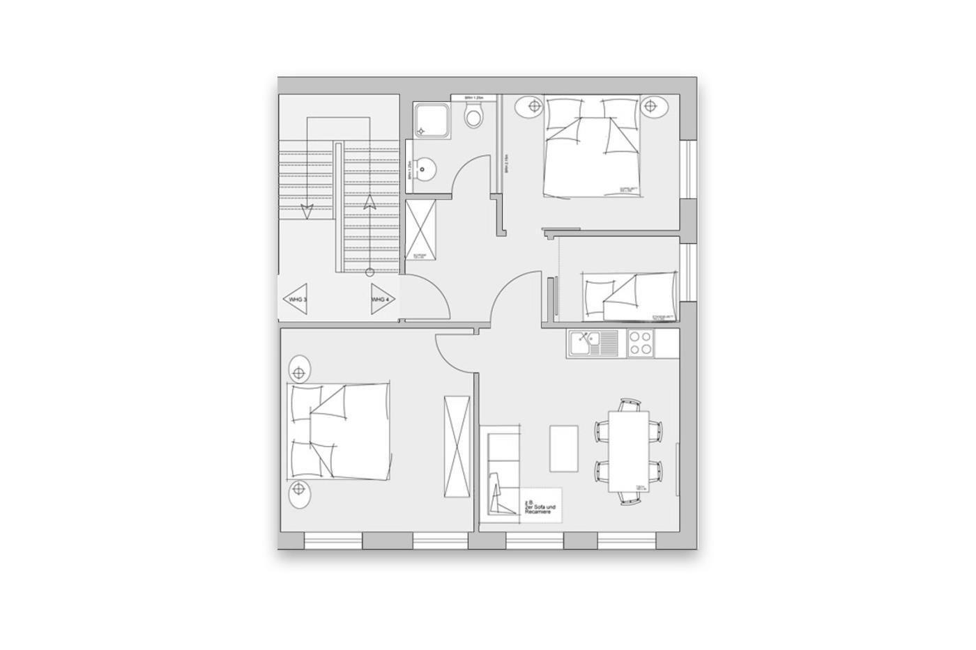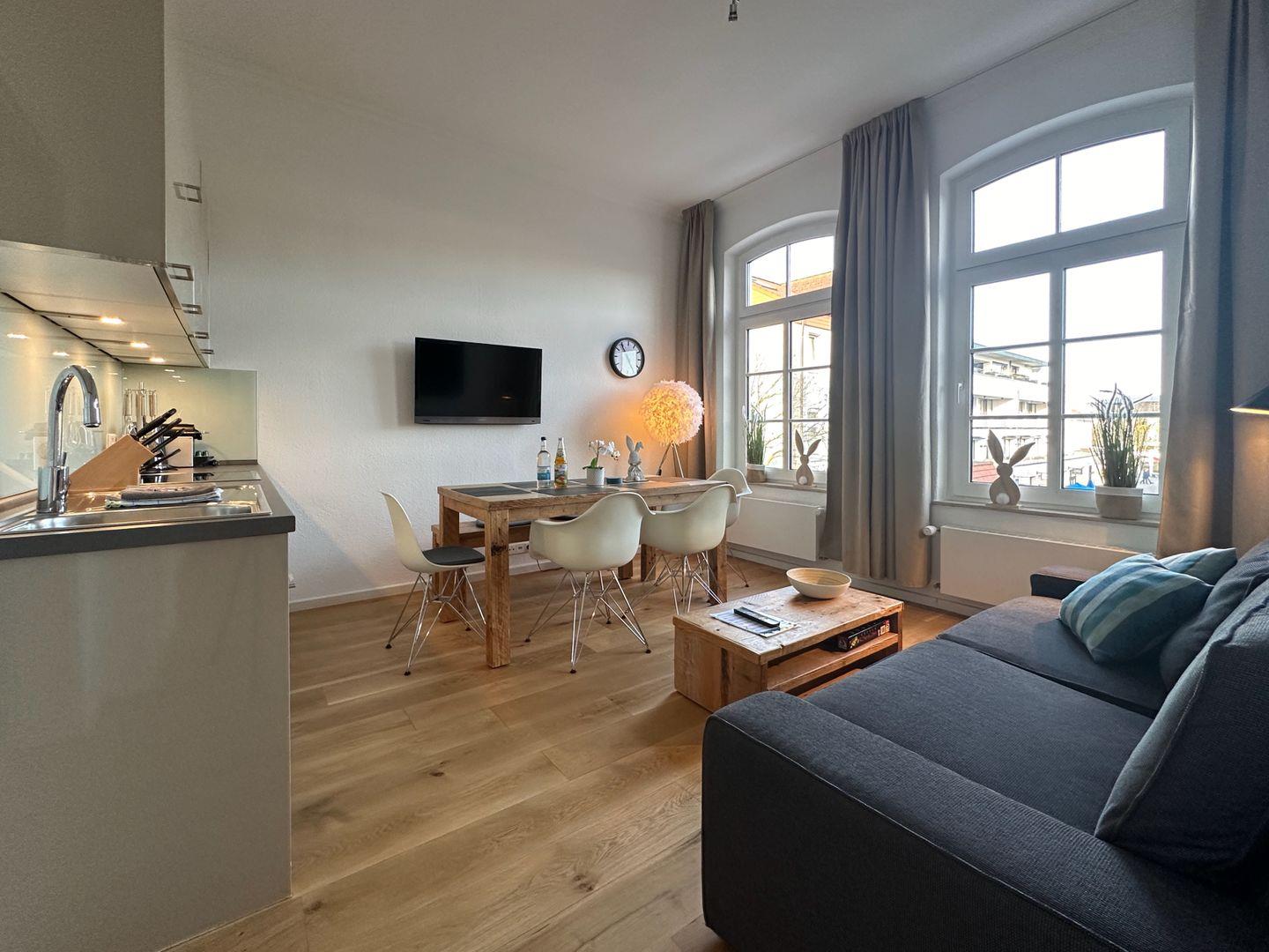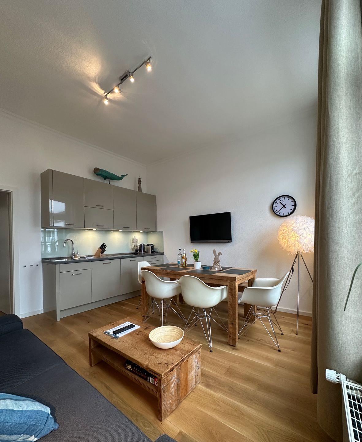 Die Wohnung verfügt über einen offenen Wohnraum mit Küchenzeile. Die moderne Einbauküche ist ausgestattet mit einer Kaffeemaschine (Filter), einem Wasserkocher, einem Toaster, einer Mikrowelle sowie einem Ceranfeld mit vier Platten und einer Spülmaschine. Ein Kühlschrank mit Eisfach rundet die Küchenausstattung ab. Es sind drei Schlafzimmer vorhanden, zwei Schlafzimmer sind mit einem Doppelbett und eins ist mit einem Etagenbett, welches speziell für Kinder konzipiert wurde und nicht für Erwachsene geeignet ist, ausgestattet. Das Bad ist zeitgemäß gestaltet und bietet eine Dusche sowie ein WC.