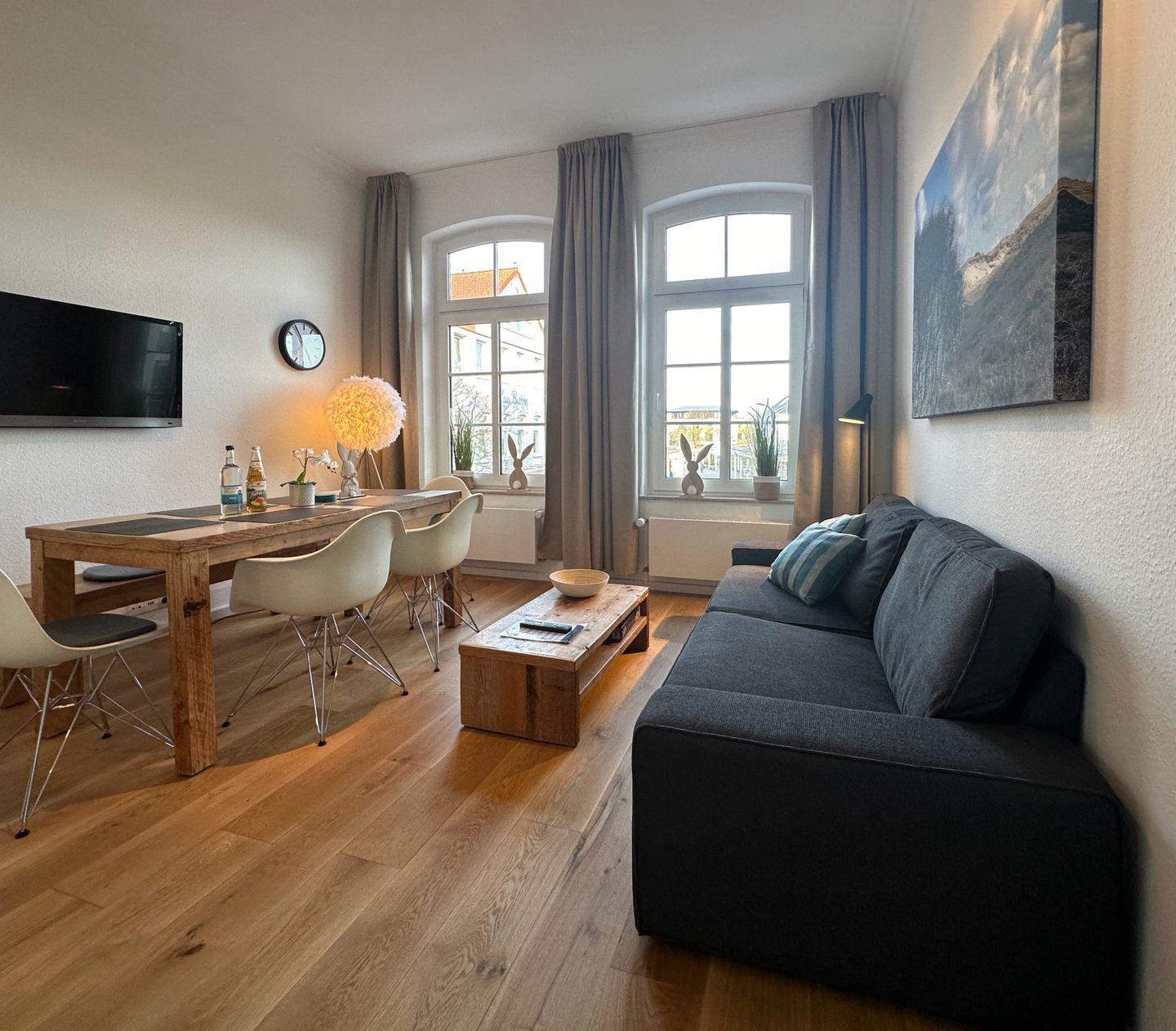 Die Ferienwohnung 4 im Haus Georg6 liegt im ersten Obergeschoss des Hauses und unmittelbar in der Nähe des Badehauses und des Kurplatzes. Mit einer Wohnfläche von ca. 60qm eignet sich die Wohnung für bis zu 6 Personen (4 Erwachsene und 2 Kinder). Das Gebäude "GEORG6" wurde 1891 im Bäderstil erbaut und steht unter Denkmalschutz. Im Ferienhaus GEORG6 wird großen Wert auf eine ruhige und entspannte Atmosphäre gelegt. Laute Musik und Partys sind nicht gestattet.