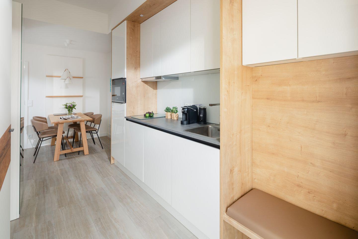 Erdgeschoss mit Wintergarten: Die Wohnung E1 liegt im Erdgeschoss (Achtung: nicht stufenlos erreichbar) und verfügt über einen Wintergarten mit Klimaanlage und Fußbodenheizung. Zur Ausstattung der Küche gehören unter anderem ein 2-Platten-Herd sowie eine Mikrowelle, ein Geschirrspüler, eine Filterkaffeemaschine und eine Kapselkaffeemaschine. Fahrräder der Hausgäste können im Innenhof abgestellt werden; Waschmaschine und Wäschetrockner stehen zur gemeinschaftlichen Nutzung im Untergeschoss bereit.