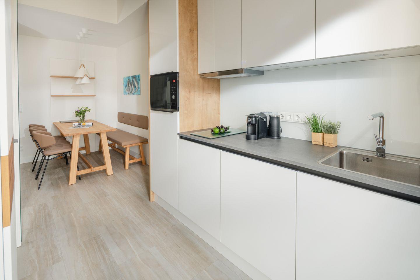 Erdgeschoss mit Wintergarten: Die Wohnung E10 liegt im Erdgeschoss (Achtung: nicht stufenlos erreichbar) und verfügt über einen Wintergarten mit Klimaanlage und Fußbodenheizung. Zur Ausstattung der Küche gehören unter anderem ein 2-Platten-Herd sowie eine Mikrowelle, ein Geschirrspüler, eine Filterkaffeemaschine und eine Kapselkaffeemaschine. Fahrräder der Hausgäste können im Innenhof abgestellt werden; Waschmaschine und Wäschetrockner stehen zur gemeinschaftlichen Nutzung im Untergeschoss bereit.