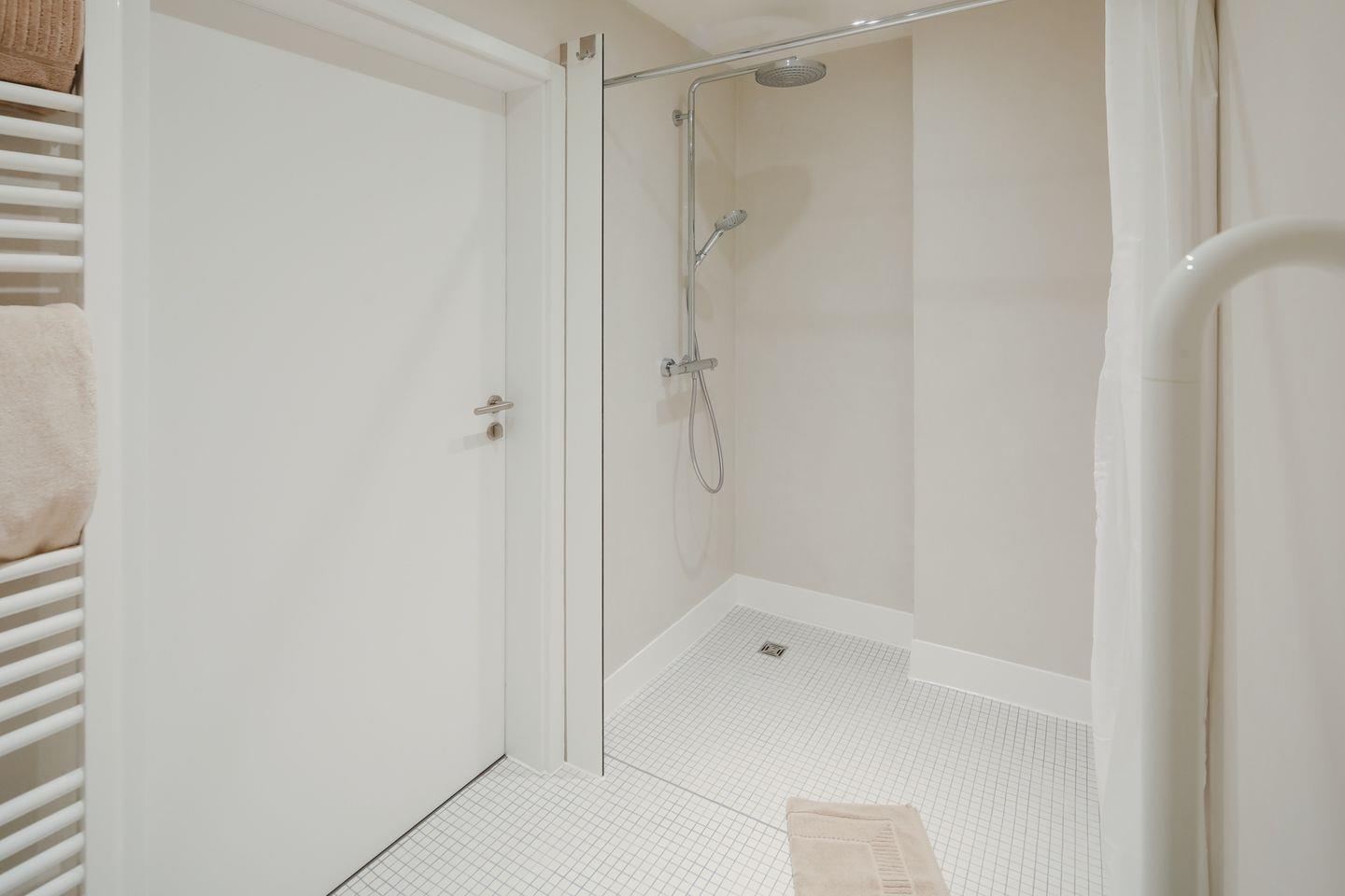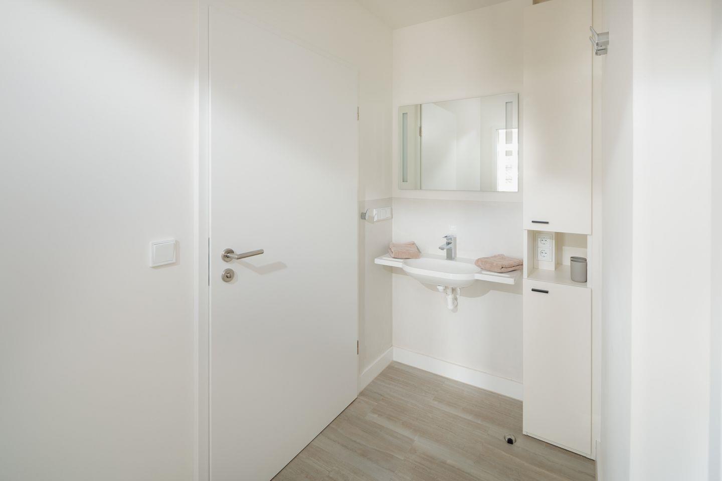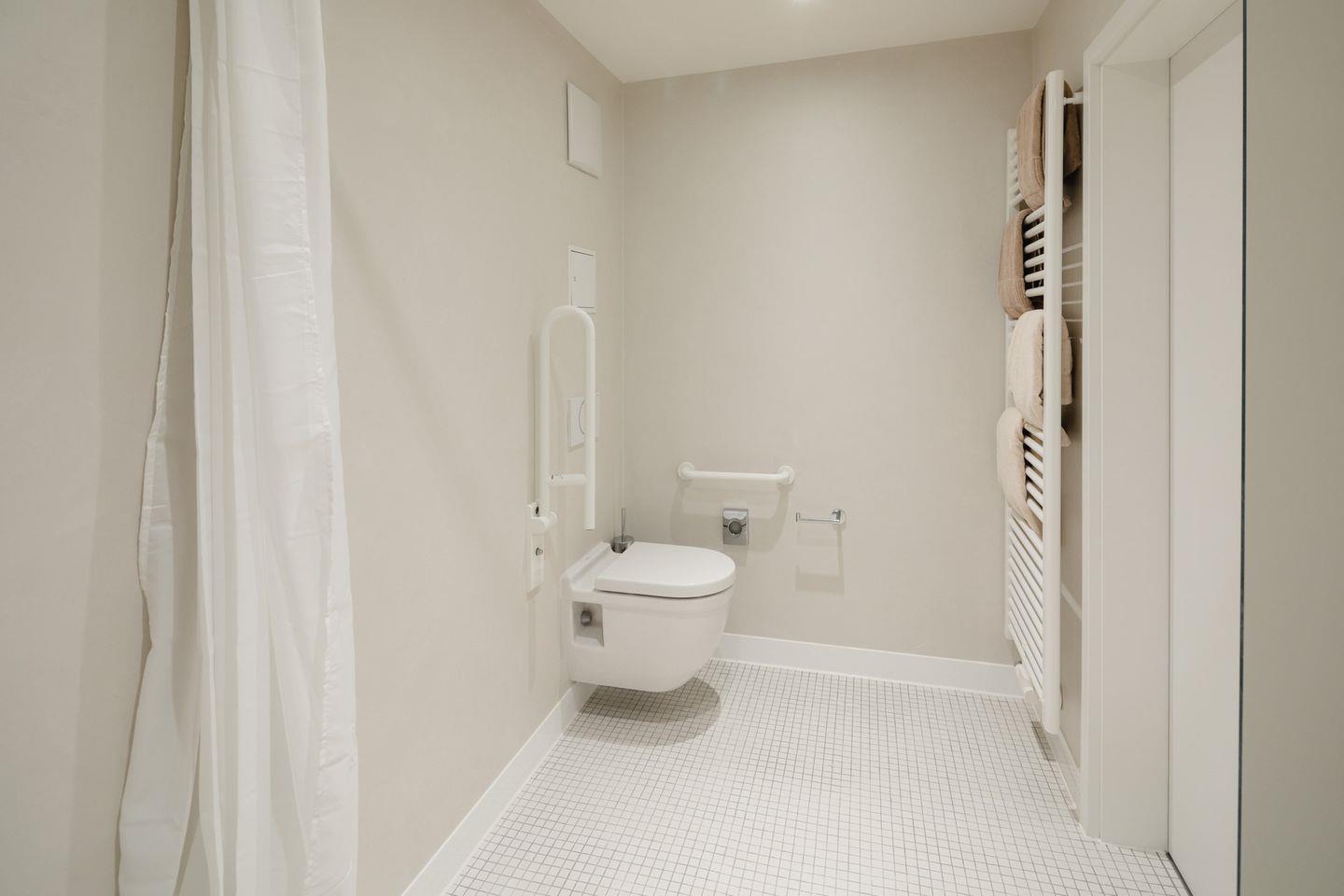 Souterrain barrierearm: Die Wohnung S4 liegt im Souterrain, ist ebenerdig zugänglich und durch die extrabreiten Türen für Rollstuhlfahrer sehr gut geeignet. Zur Ausstattung der Küche gehören unter anderem ein 2-Platten-Herd sowie eine Mikrowelle, ein Geschirrspüler, eine Filterkaffeemaschine und eine Kapselkaffeemaschine. Fahrräder der Hausgäste können im Innenhof abgestellt werden; Waschmaschine und Wäschetrockner stehen zur gemeinschaftlichen Nutzung im Untergeschoss bereit.