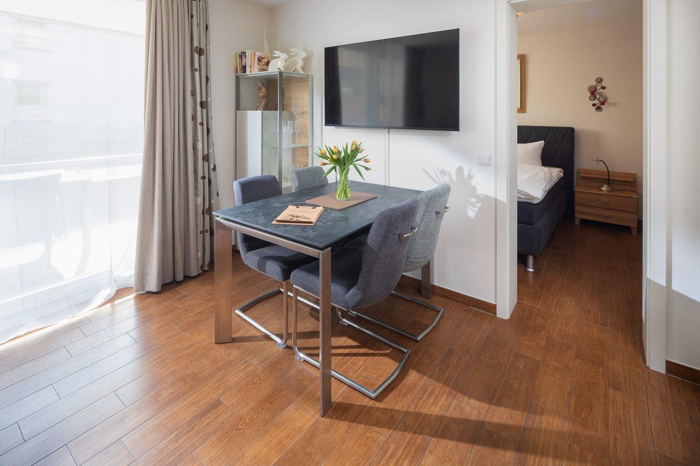 Die Wohnung verfügt über zwei gemütliche Schlafzimmer, jeweils ausgestattet mit einem komfortablen Doppelbett und Verdunkelungsmöglichkeiten für erholsamen Schlaf. Der offene Wohnbereich kombiniert eine gut ausgestattete Küche mit dem Ess- und Wohnbereich. Die Küche bietet moderne Geräte wie Cerankochfeld, Backofen, Mikrowelle, Kühlschrank mit Gefrierfach, Geschirrspüler, Kaffeemaschine, Wasserkocher und Toaster. Ein Esstisch lädt zu gemeinsamen Mahlzeiten ein, während die angrenzende Sofaecke mit TV zum Entspannen einlädt.?