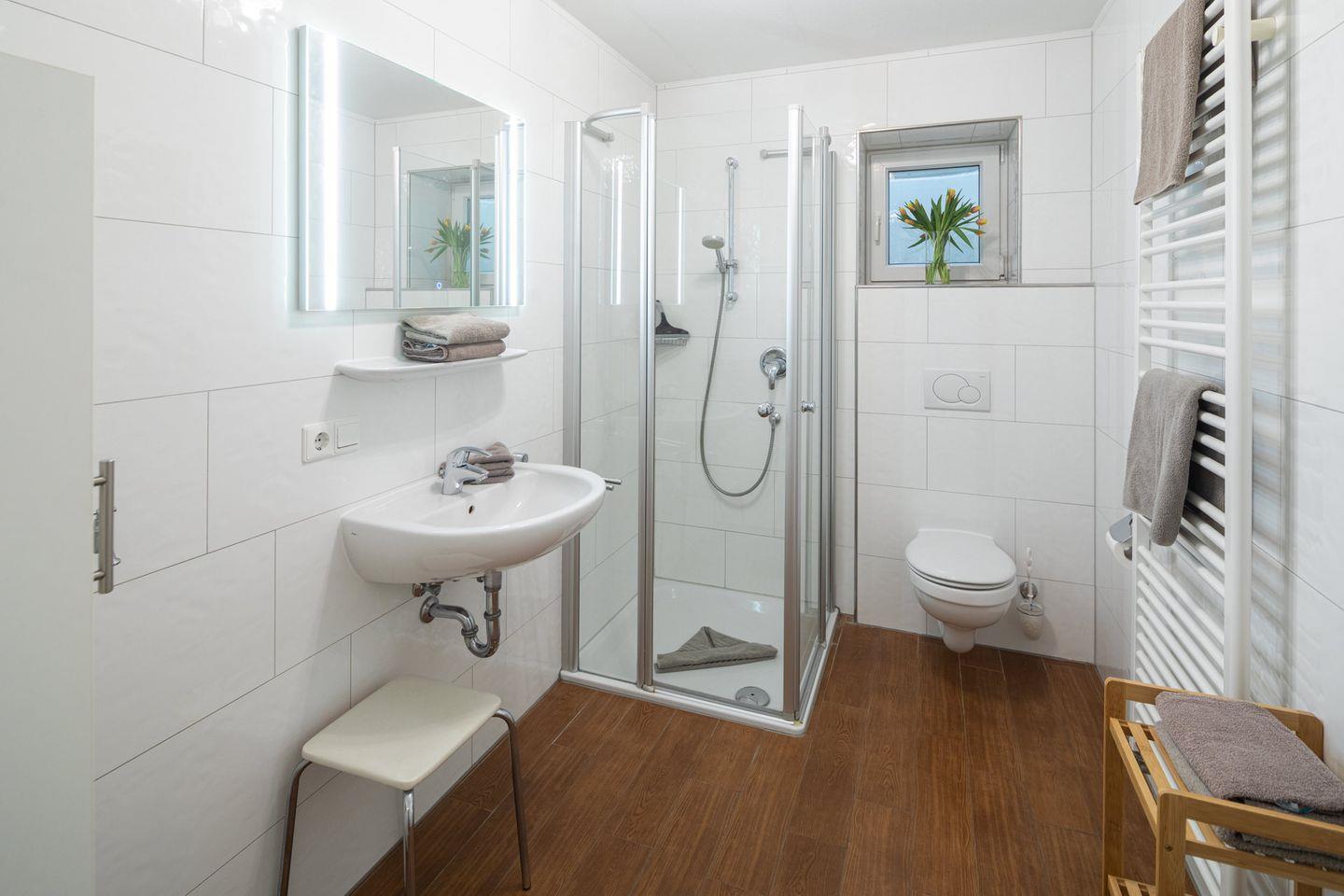 Das Untergeschoss beherbergt ein weiteres Schlafzimmer mit Doppelbett sowie ein zweites Badezimmer, das mit einer Dusche ausgestattet ist. Für Familien mit kleinen Kindern stehen ein Babybett und ein Hochstuhl bereit.