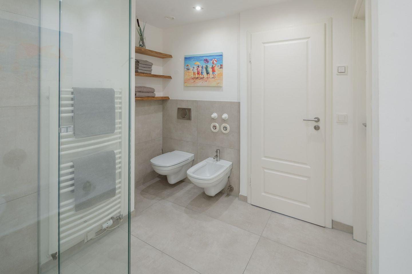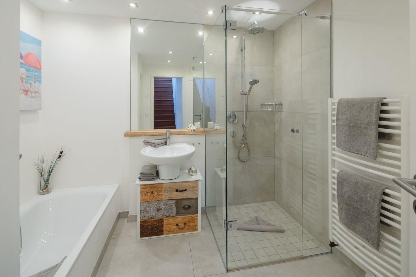 Das moderne Badezimmer bietet sowohl eine Badewanne als auch eine Dusche, sodass Sie zwischen einem entspannenden Bad oder einer erfrischenden Dusche wählen können. Ein zusätzliches Gäste-WC sorgt für noch mehr Komfort.