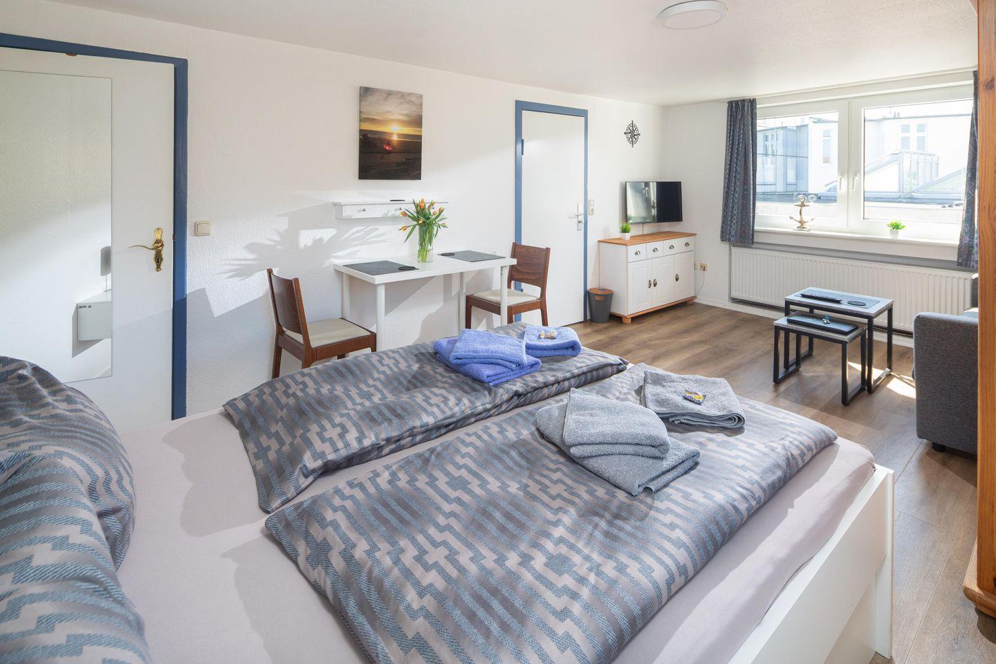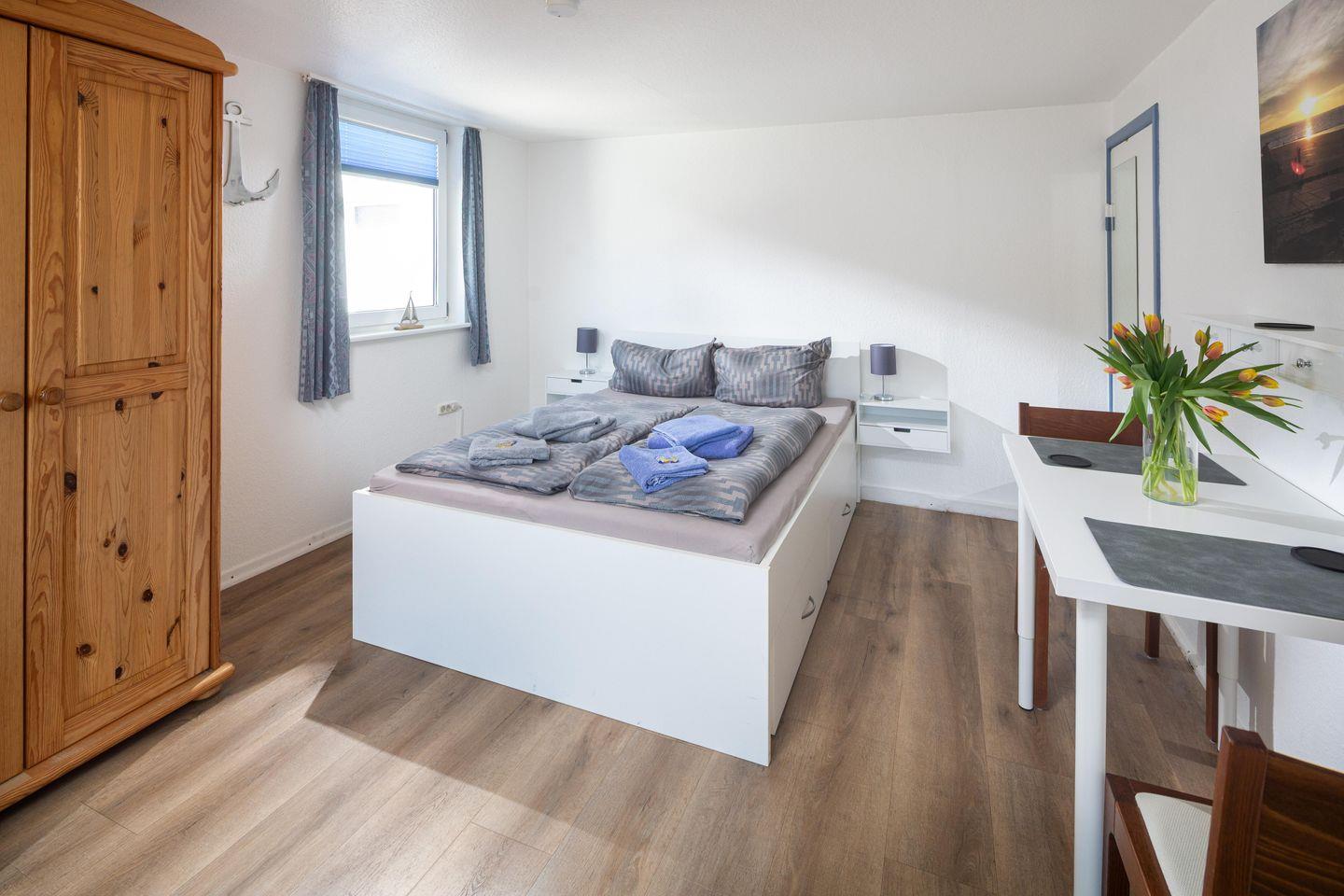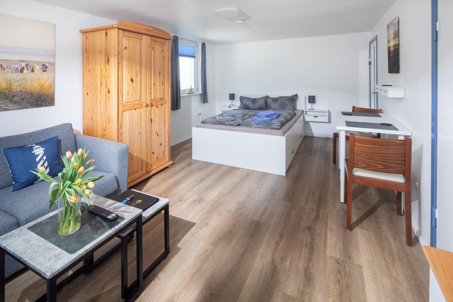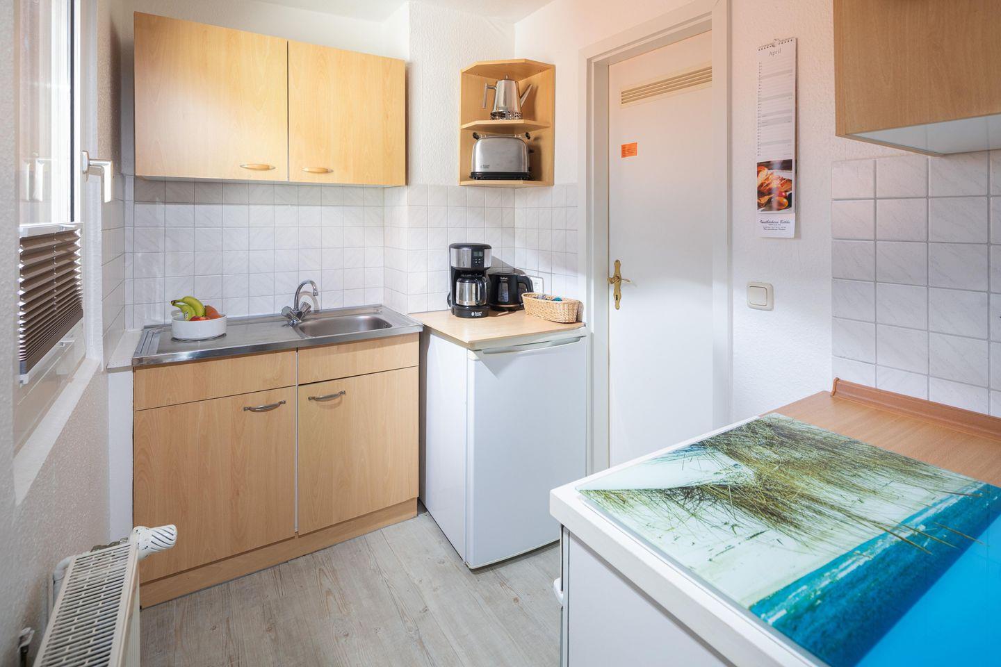 Die 1-Raum-Ferienwohnung im ersten Obergeschoss verfügt über einen Wohn-/Schlafraum mit Doppelbett (140x200cm), Kabel-TV, Essecke, separater Küche (4-Plattenherd, Backofen) und Bad mit Dusche/WC.