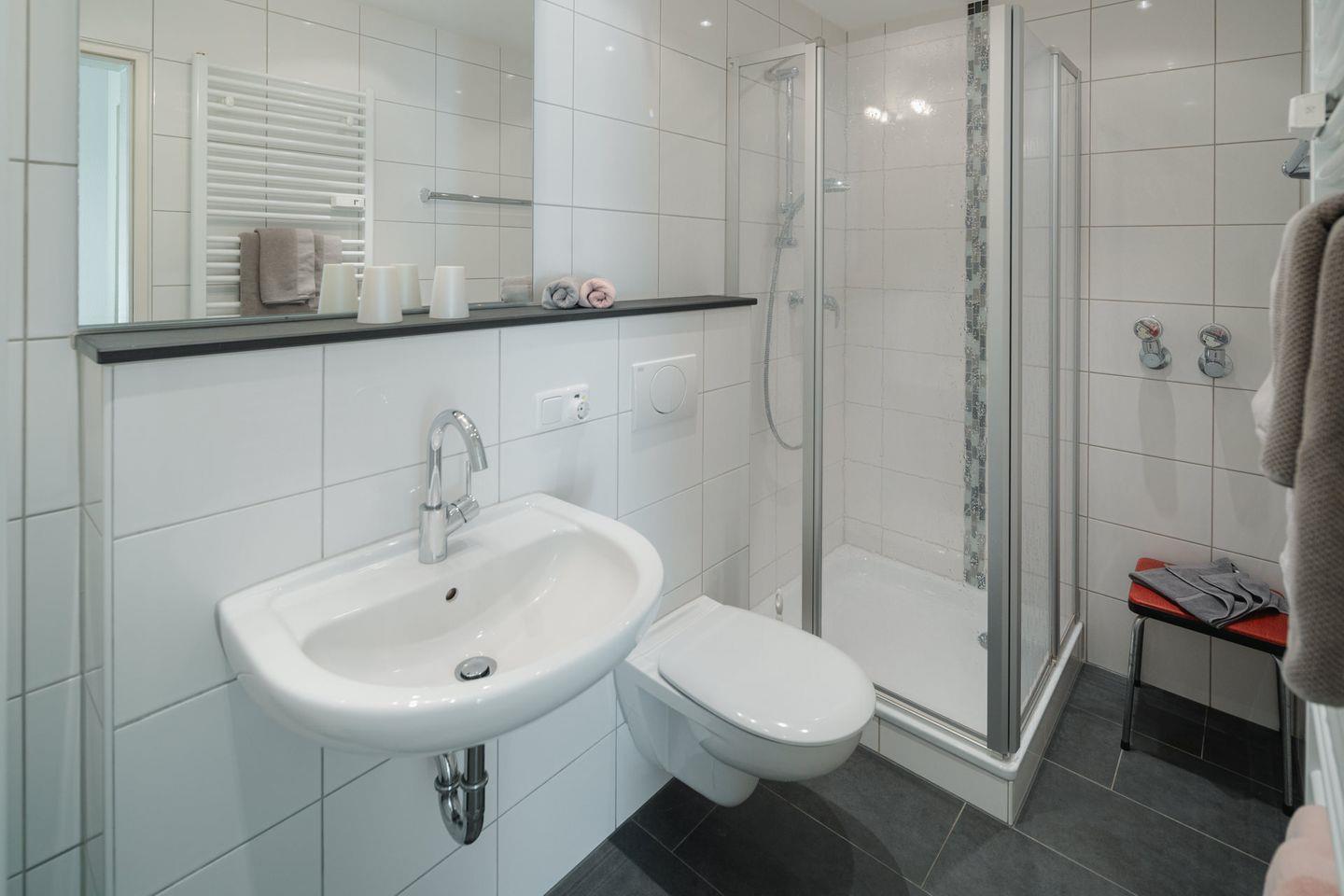 Das Badezimmer ist komfortabel eingerichtet und verfügt sowohl über eine Dusche, ideal für entspannende Wellness-Momente nach einem Tag am Strand, der nur wenige Schritte von Ihrer Unterkunft entfernt ist. Ein Haartrockner, Handtücher (Erstausstattung) gehören ebenfalls zur Ausstattung, sodass Sie sich um nichts kümmern müssen.