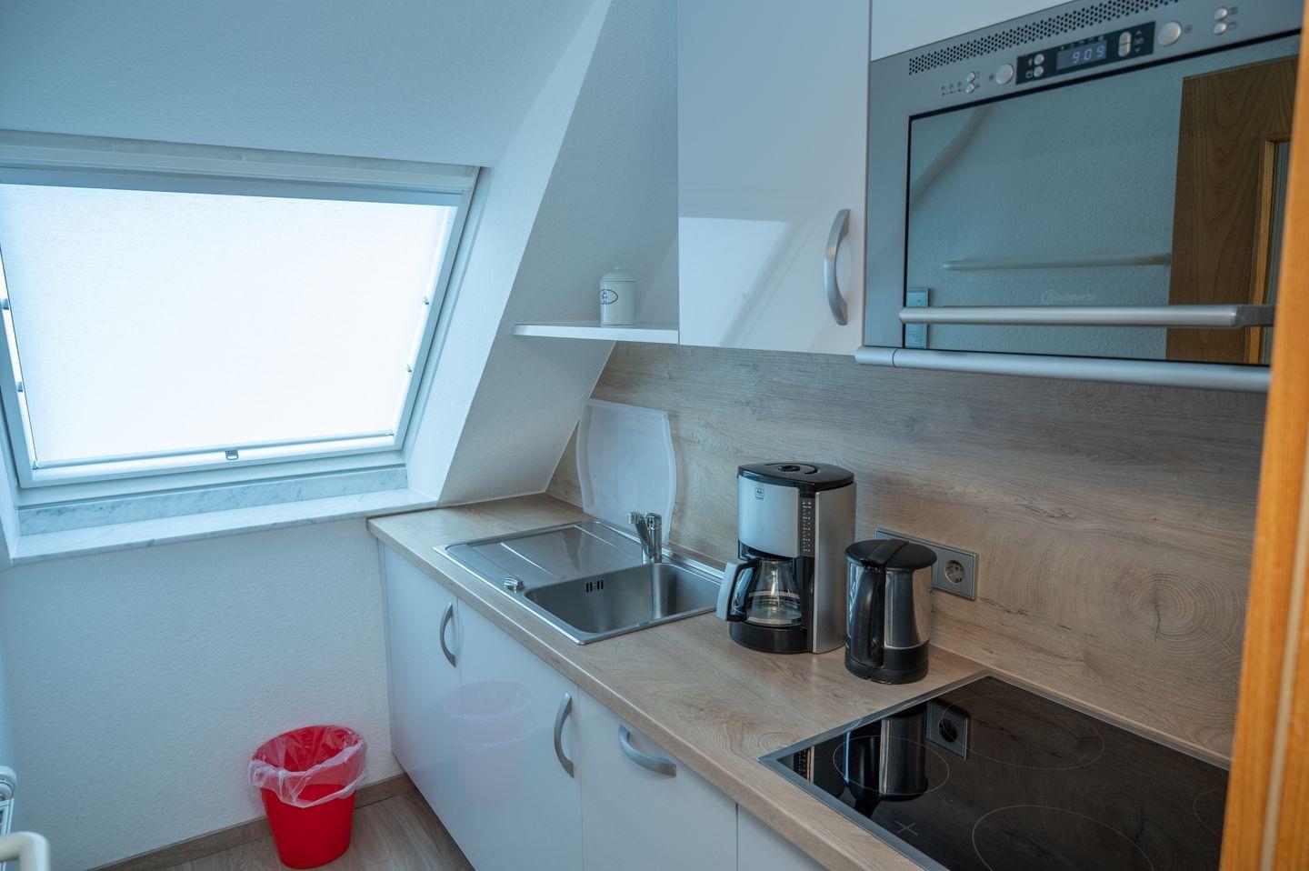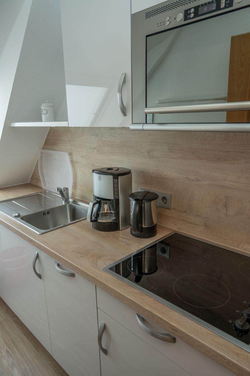 Die Wohnung befindet sich im ersten Stock und verfügt über ein behagliches Wohnzimmer, mit modernen Annehmlichkeiten. Hier können Sie sich entspannen und die Zeit mit Ihren Liebsten genießen. Der geschlossene Küchenbereich erfüllt alle Wünsche, egal ob Sie eine schnelle Mahlzeit zubereiten oder ein festliches Dinner planen. Die Küche beinhaltet eine Spülmaschine, Mikrowelle, Kühlschrank, Herd und alle nötigen Küchenutensilien – einfach perfekt für einen unbeschwerten Aufenthalt.