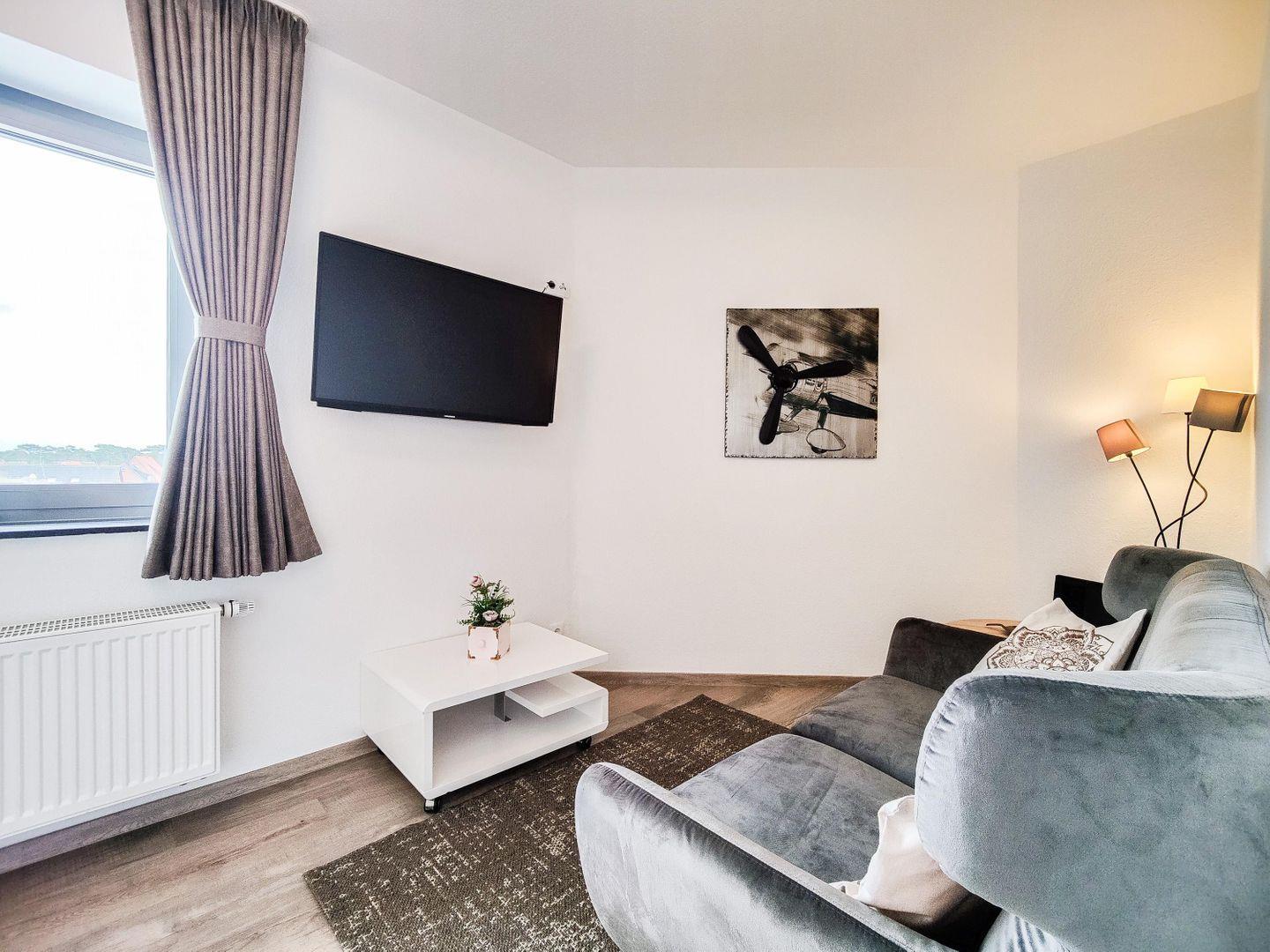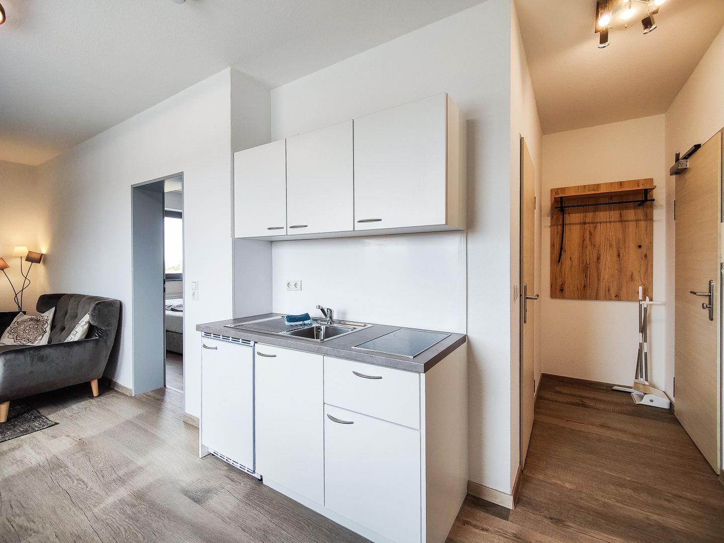 Die offene Küche ist bestens ausgestattet – Herd, Kühlschrank, Mikrowelle und alle wichtigen Utensilien sind da. Genieße deine Mahlzeiten am Esstisch oder entspanne auf dem Sofa mit einem Film auf dem großen TV. WLAN steht dir natürlich auch zur Verfügung.