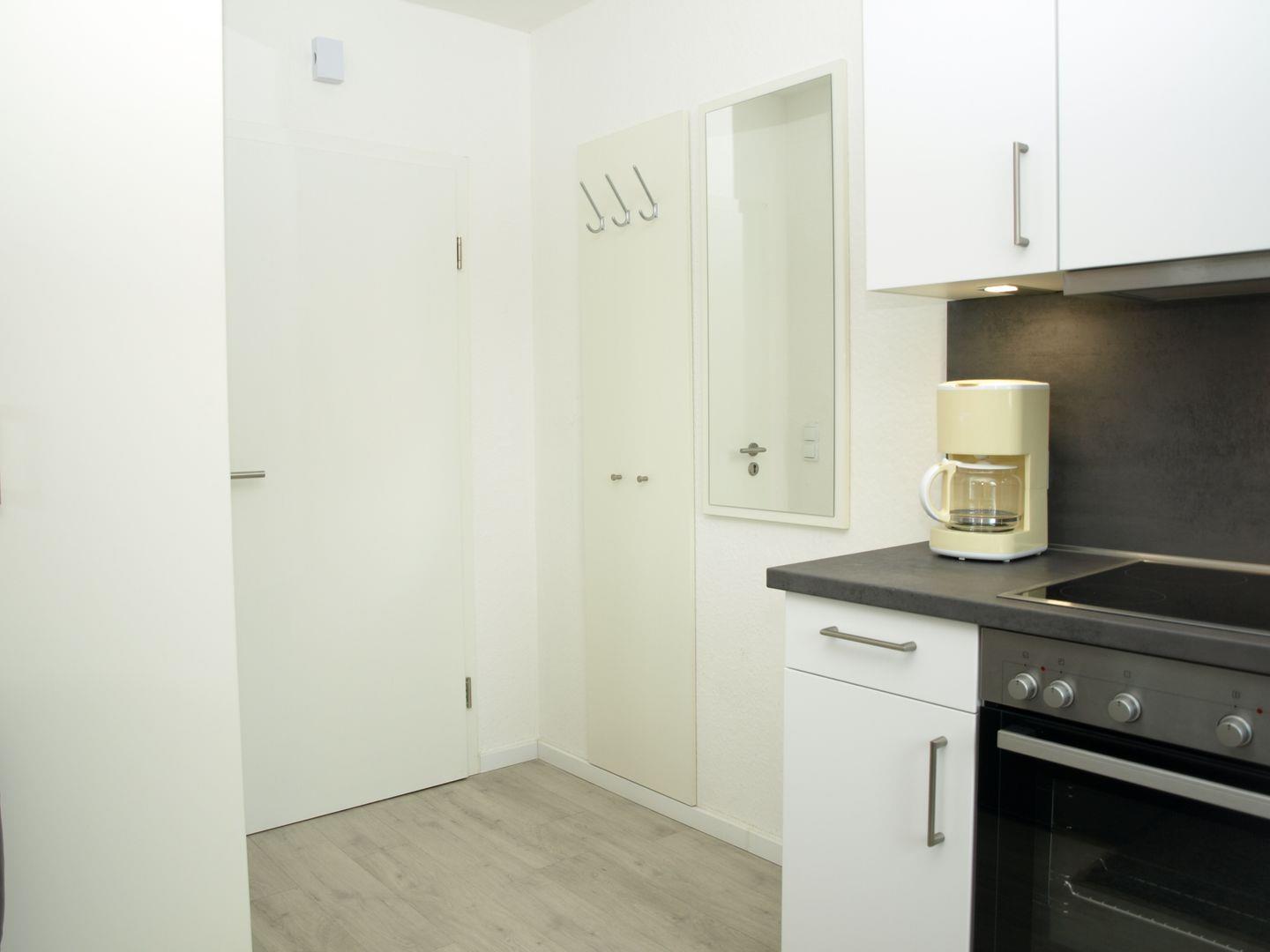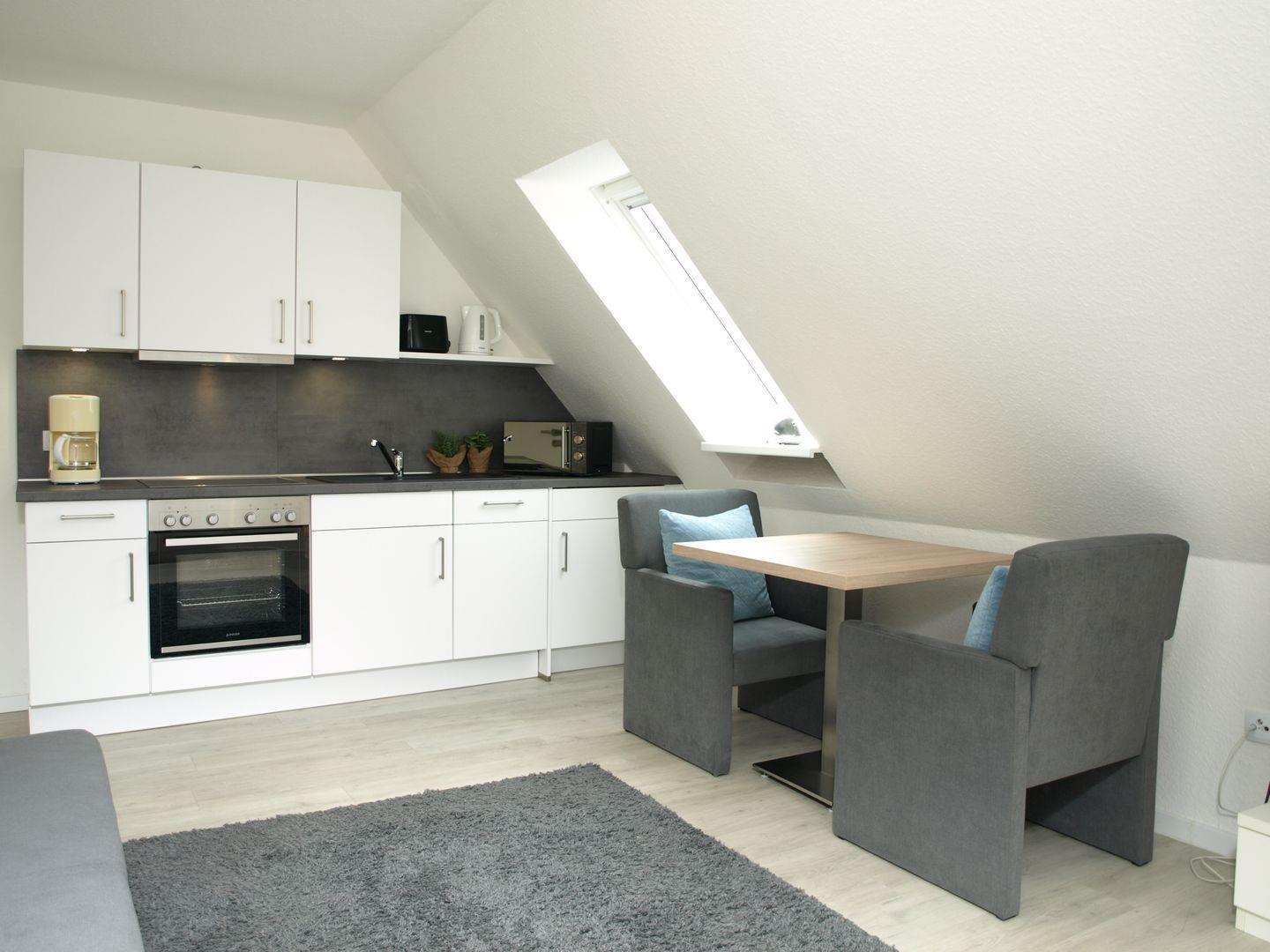 Die komplett ausgestattete Küchenzeile lässt keine Wünsche offen und bietet alles, was Sie zur Selbstverpflegung benötigen. Am Esstisch für zwei Personen lässt sich der Tag gemütlich beginnen oder ausklingen. Das helle Tageslichtbad verfügt über eine Dusche und ein WC.
