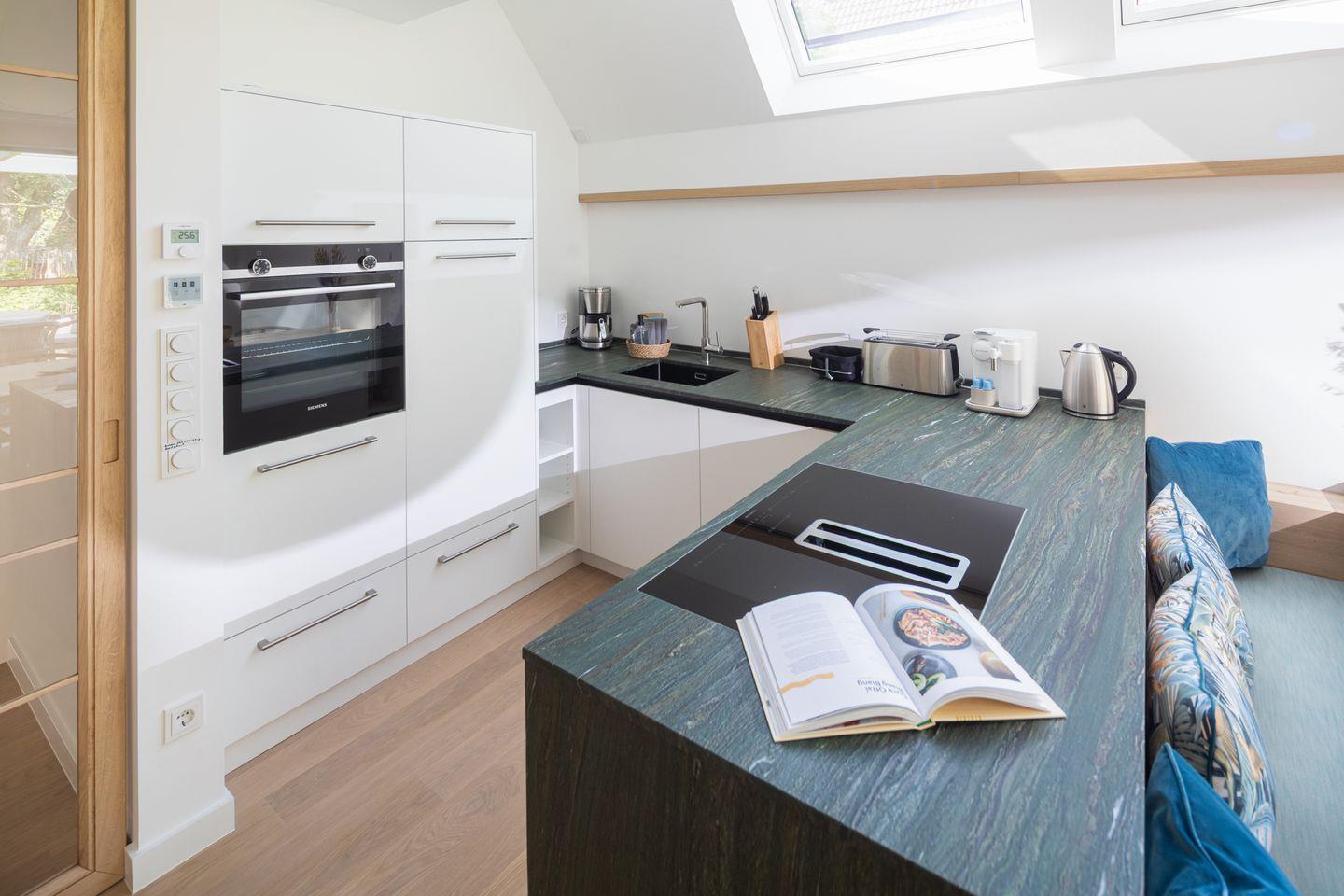 Die moderne Küche ist komplett ausgestattet und bietet alles, was Hobbyköche oder Kaffeeliebhaber sich wünschen: Induktionskochfeld, Geschirrspüler, Backofen, hochwertige Ausstattung, jede Menge Stauraum – und das Beste: ein großzügiger Essbereich mit Platz für alle. Hier wird gemeinsam gekocht, gegessen, gelacht. Der direkte Zugang zur überdachten Terrasse mit Markise macht den Übergang zwischen drinnen und draußen ganz leicht.