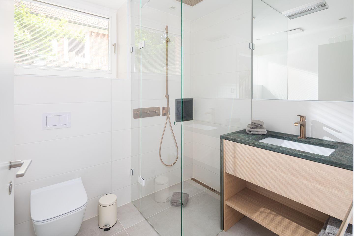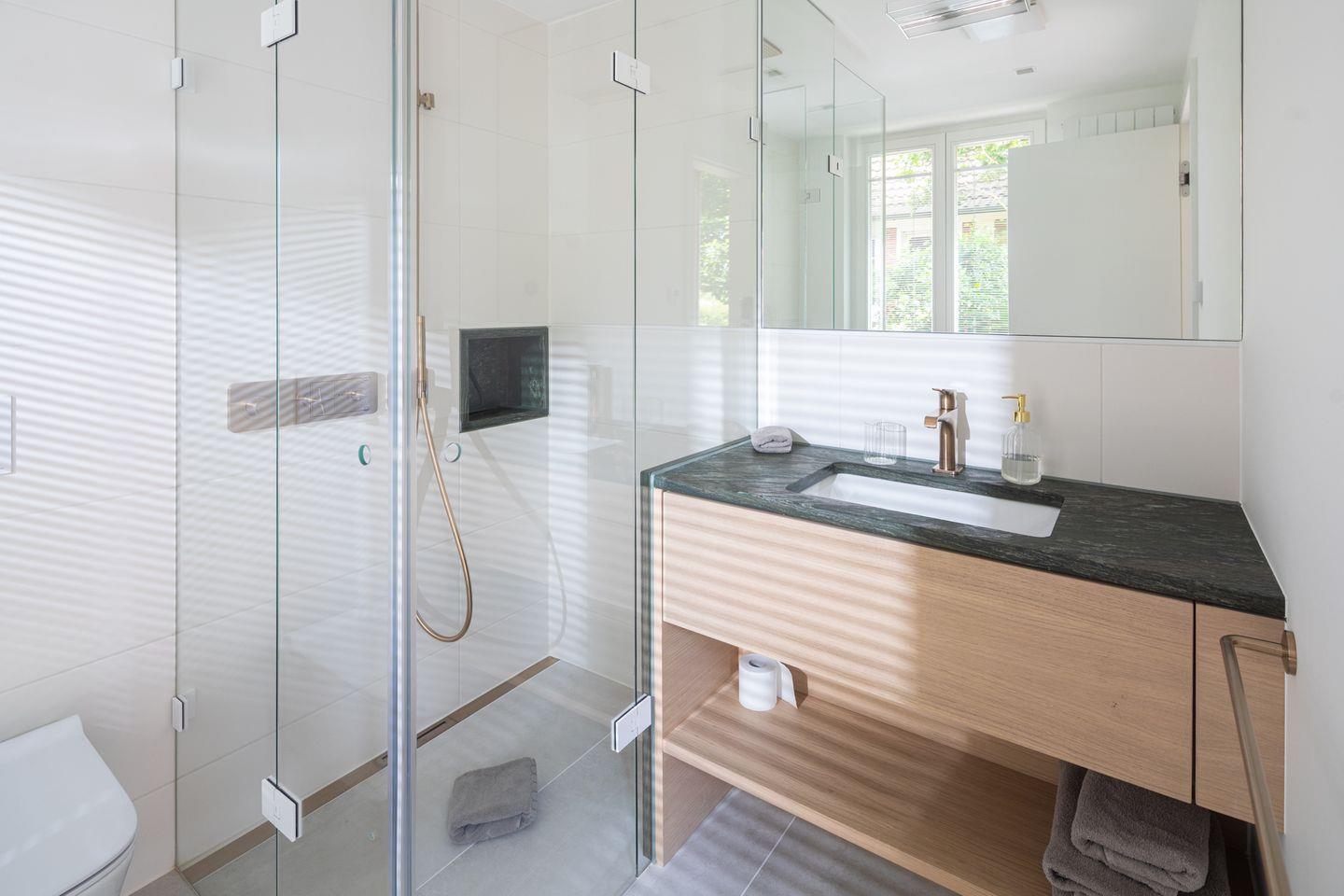 Drei moderne Badezimmer, jeweils direkt am Schlafzimmer, bieten höchsten Komfort: bodengleiche Duschen, stilvolle Fliesen, elegante Armaturen – alles hochwertig, alles durchdacht. Kein Gedrängel am Morgen, kein Warten auf die Dusche – hier hat jeder seinen eigenen Platz.