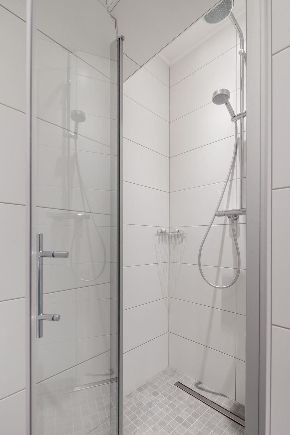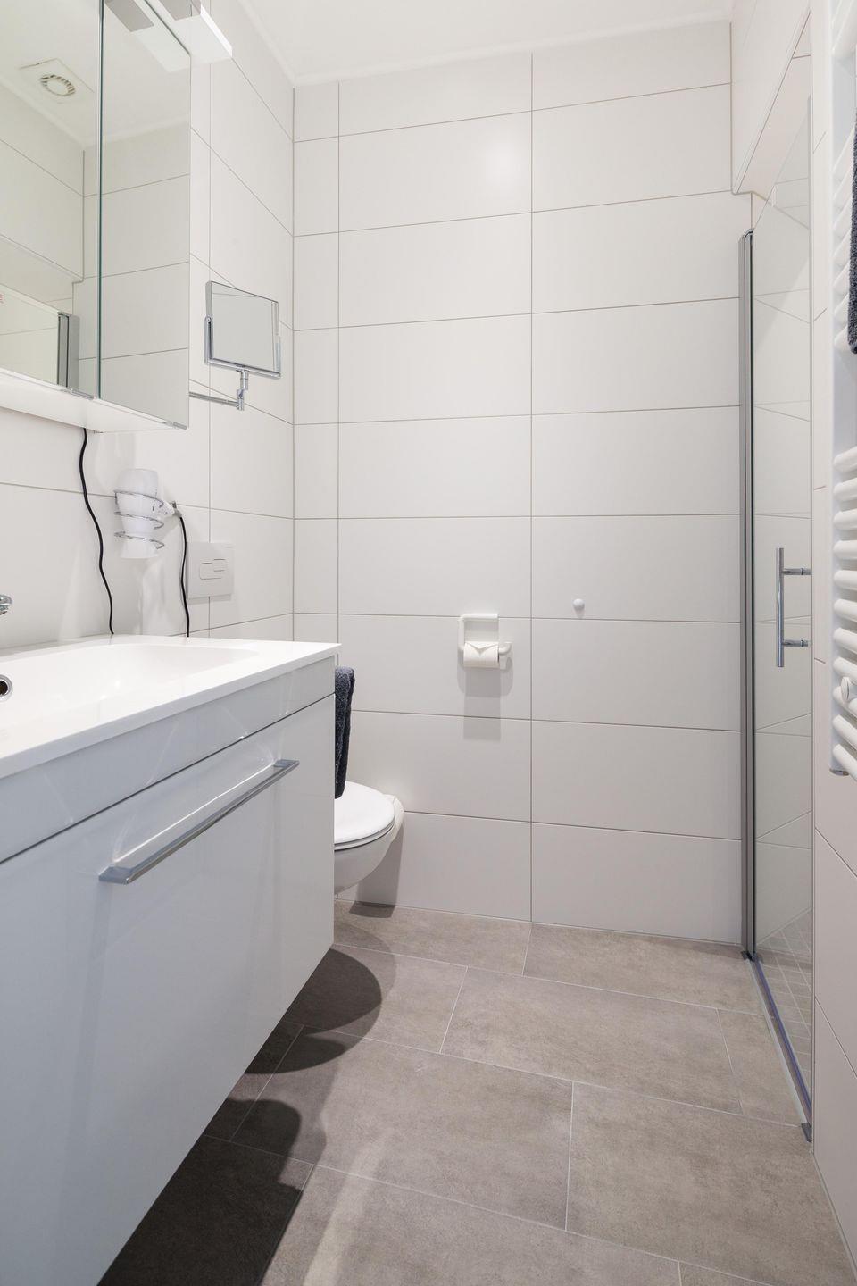 Ein paar Stufen führen nach unten, wo das separate Schlafzimmer mit großzügigem Boxspringbett wartet – ruhig, hell und ideal für erholsame Nächte. Das Duschbad ist modern und freundlich gestaltet, mit ebenerdiger Dusche, Waschtisch, großem Vergrößerungsspiegel und WC – eine stilvolle und funktionale Rückzugsoase.