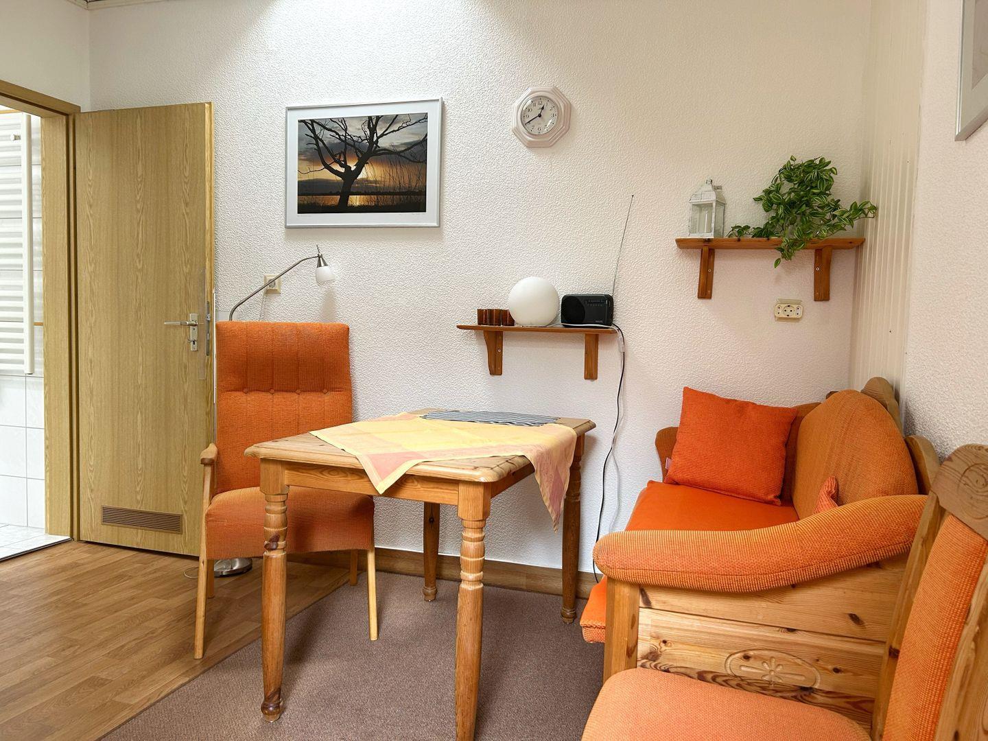 Die 2-Raum-Ferienwohnung (ca. 40qm²) verfügt über ein separates Schlafzimmer mit Doppelbett, Wohnraum mit Essecke, Sofa (TV) und Kochnische (2-Platten-Herd, Kühlschrank) sowie Badezimmer mit Dusche/ WC.