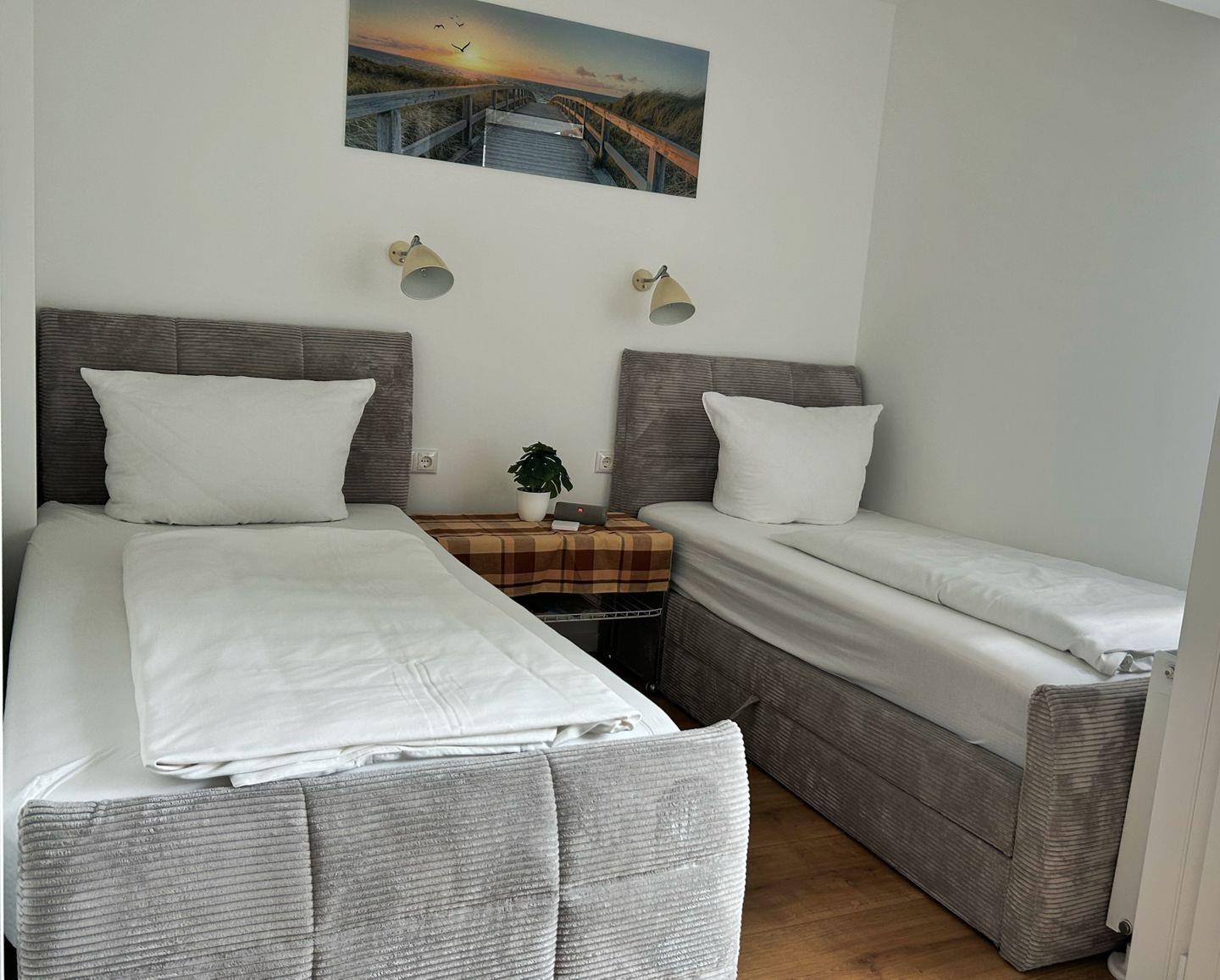 Diese großzügige und modern eingerichtete Zwei-Raum-Ferienwohnung im 1. Obergeschoss lädt zum Wohlfühlen ein. Im separaten Schlafzimmer erwartet Sie ein komfortables Doppel-Boxspringbett sowie ein eigener Fernseher – ideal für entspannte Stunden. Der offene Wohnbereich ist mit gemütlichem Sofa, TV und einem einladenden Essbereich ausgestattet. Eine praktische Nische mit zwei Einzel-Boxspringbetten bietet zusätzlichen Schlafkomfort für Familie oder Freunde.