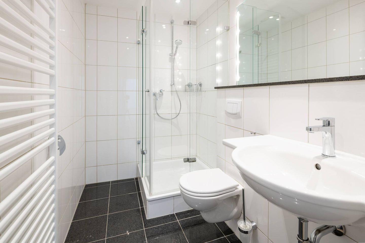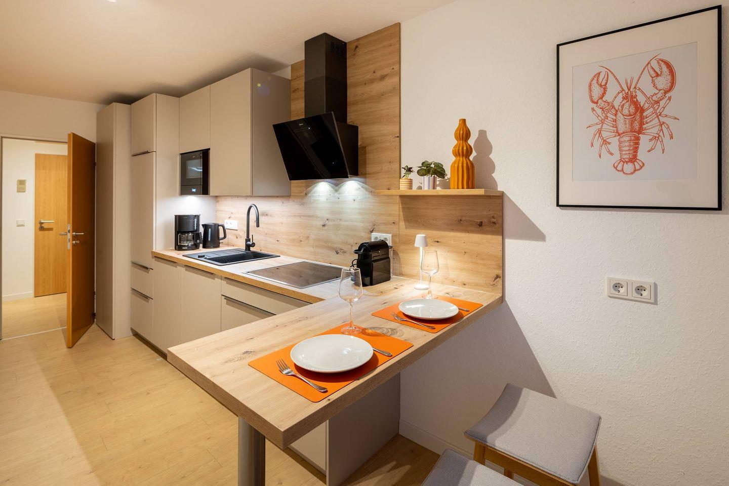 Über den Flur sind alle Räume bequem erreichbar. Der helle Wohnbereich mit gemütlichen Sofas, großem Flat-TV und moderner Essecke lädt zum Entspannen ein. Direkt angrenzend befindet sich die separate Küche mit praktischer Theke – ideal für kleine Mahlzeiten oder den Kaffee zwischendurch.