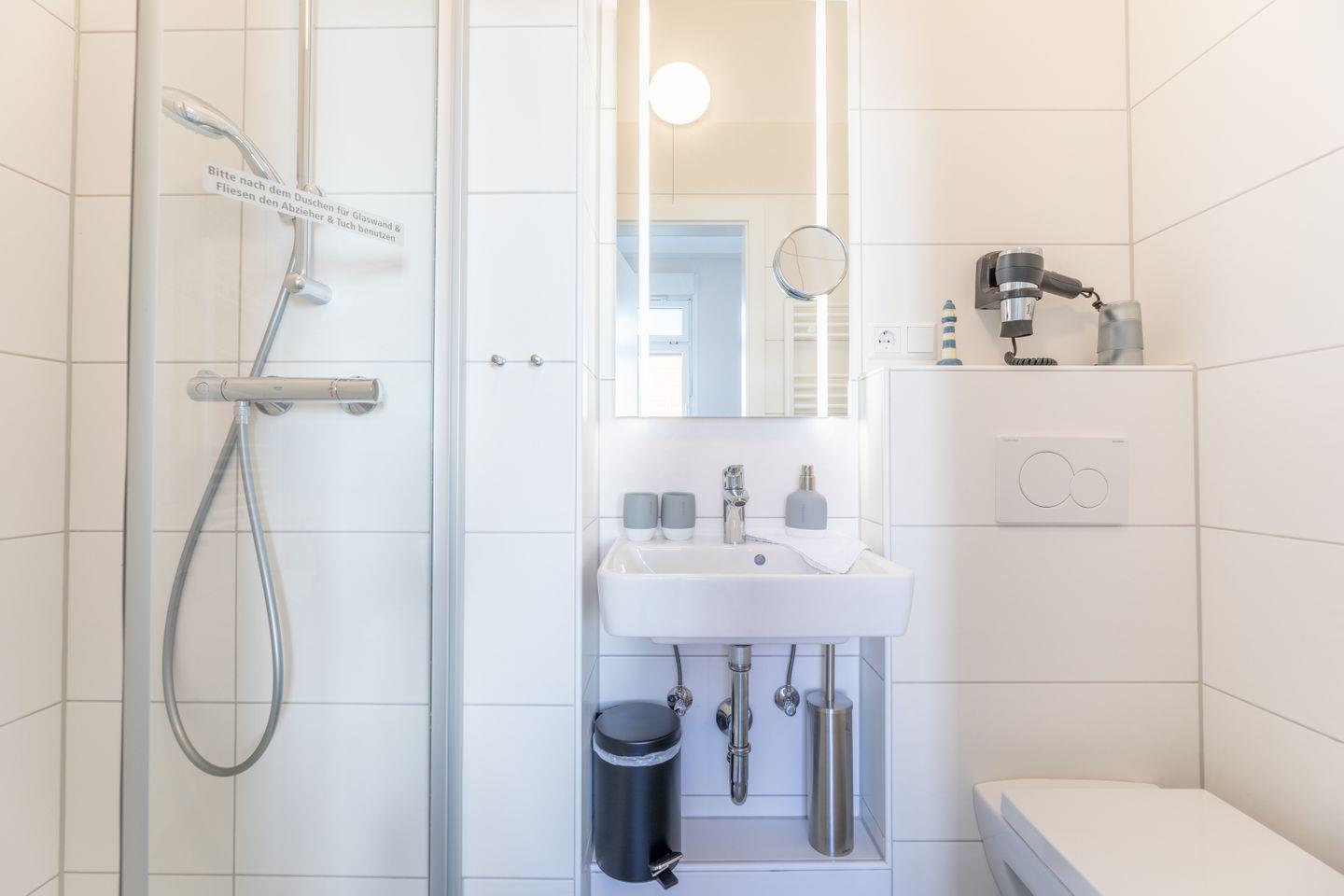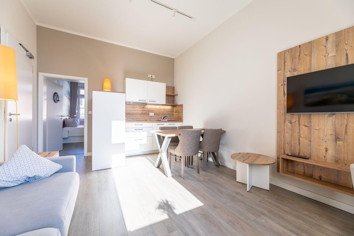 Kajüte 6 im Ferienhaus Inselanker erstrahlt im modernen maritimen Stil – hell, freundlich und gemütlich. Die Zweiraumwohnung auf 38 m² im 1. Obergeschoss (Deck 2) bietet Platz für bis zu 4 Personen und ist ideal für Familien mit Kind oder Baby. Der Wohnbereich mit Couch, Sessel und TV lädt zum Entspannen ein, die gut ausgestattete Küchenzeile mit Essplatz sorgt für gemeinsame Mahlzeiten. Im separaten Schlafzimmer sorgen Doppelbett und auf Wunsch ein Babybett für erholsame Nächte, die Schlafcouch bietet zusätzliche Schlafmöglichkeiten. Das Bad mit Dusche rundet den Komfort ab – perfekt für einen entspannten Norderney-Urlaub mit Sonne, Strand und Meeresluft.