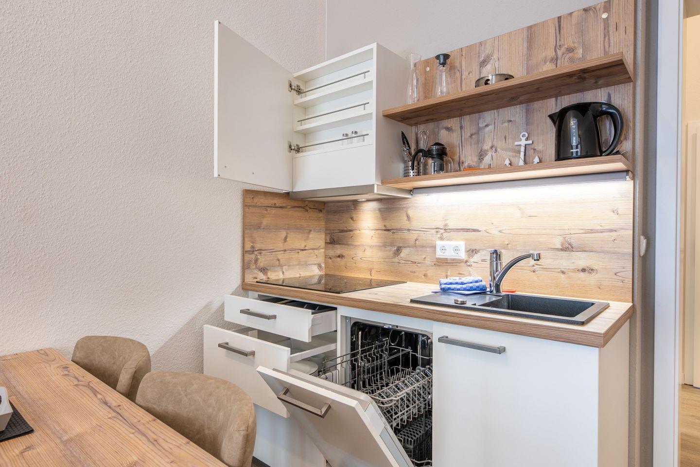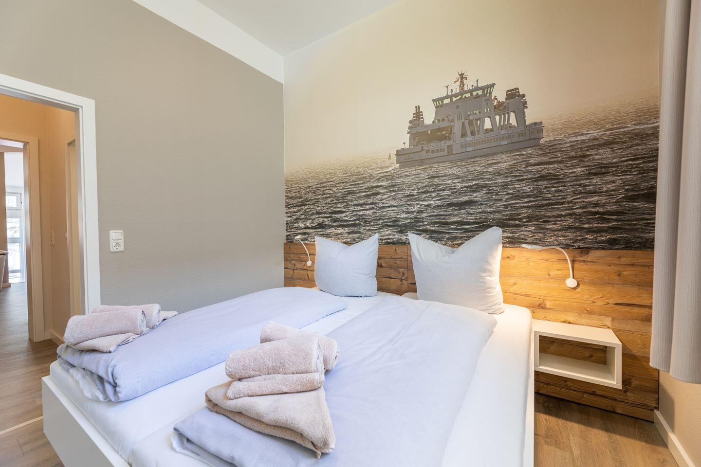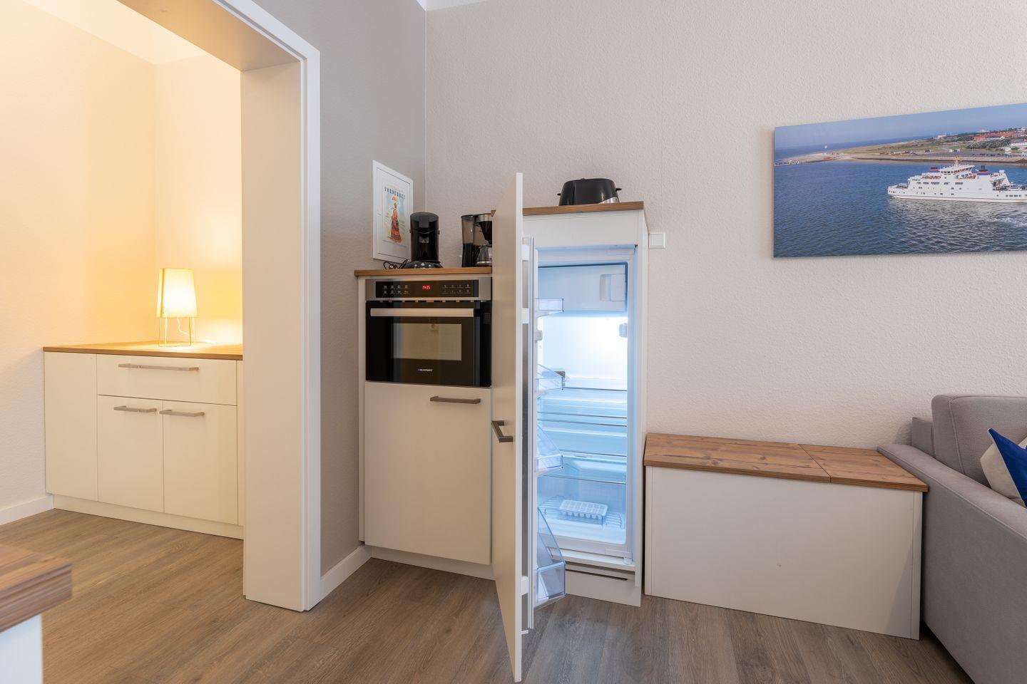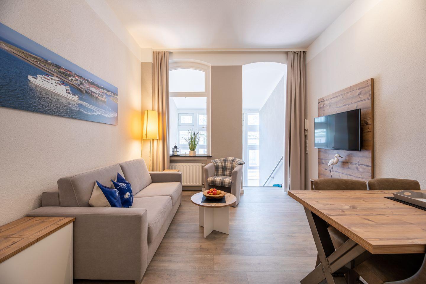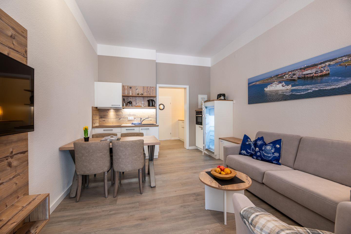 Kajüte 7 im Ferienhaus Inselanker erstrahlt im modernen maritimen Stil – hell, freundlich und gemütlich, mit viel Flair durch die hohe Verandaraumgestaltung. Auf 45 m² erstreckt sich die Wohnung über Erdgeschoss und 1. Etage und bietet Platz für bis zu 4 Personen, auch mit Hund. Im Wohnbereich laden Sofa (als Schlafsofa 170×190?cm) und Cocktailsessel zum Entspannen ein, die voll ausgestattete Küche mit Essplatz sorgt für gemeinsame Mahlzeiten. Im separaten Schlafzimmer stehen ein Doppelbett und ein großer Kleiderschrank bereit. Das Bad mit Dusche und WC ist modern eingerichtet, zwei TV-Flachbildschirme runden den Komfort ab. Ideal für Familien, Freunde oder Hundebesitzer, die das typische Norderneyer Urlaubsgefühl genießen möchten.