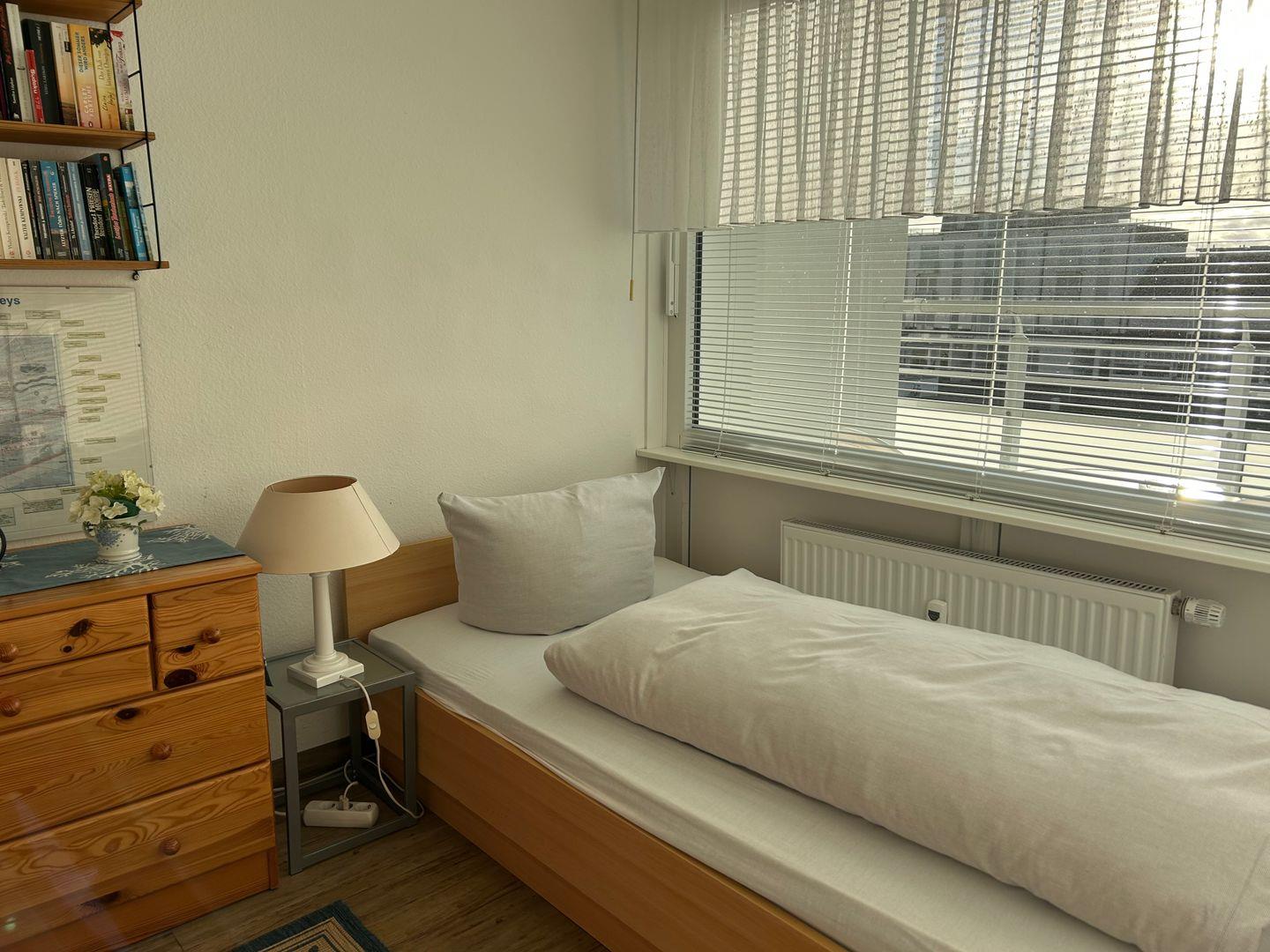 Das Apartment 102 in der 2. Etage verfügt über ein separates Schlafzimmer mit Etagenbett & Einzelbett, Wohnraum mit Küche (4-Plattenherd, Backofen, Spülmaschine, Mikrowelle) sowie Badezimmer mit Dusche/WC. Der Balkon hat seitlichen Meerblick. Die Wohnung befindet sich im Haus Kaiserstraße 18. WLAN vorhanden.