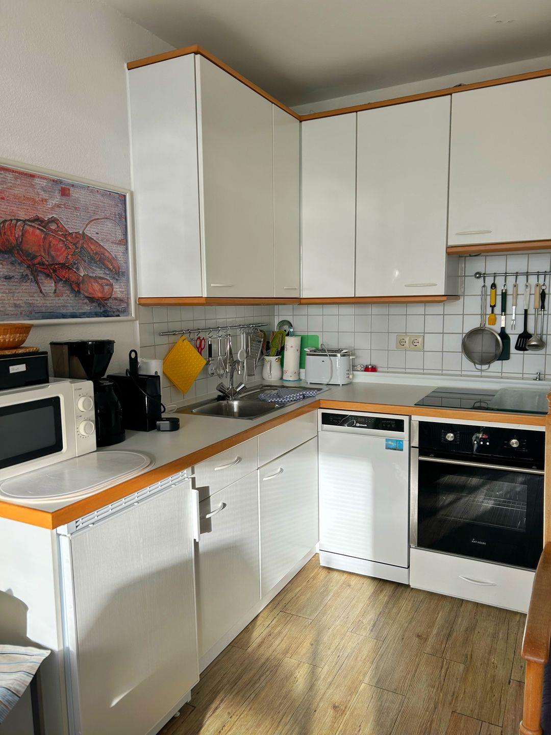 Das Apartment 102 in der 2. Etage verfügt über ein separates Schlafzimmer mit Etagenbett & Einzelbett, großzügiger Wohnraum mit vollständig ausgestatteter Küche (4-Plattenherd, Backofen, Spülmaschine, Mikrowelle). Das Badezimmer ist funktional und modern eingerichtet mit Dusche, Waschbecken und WC.