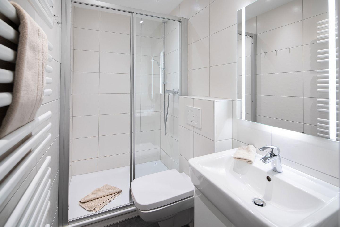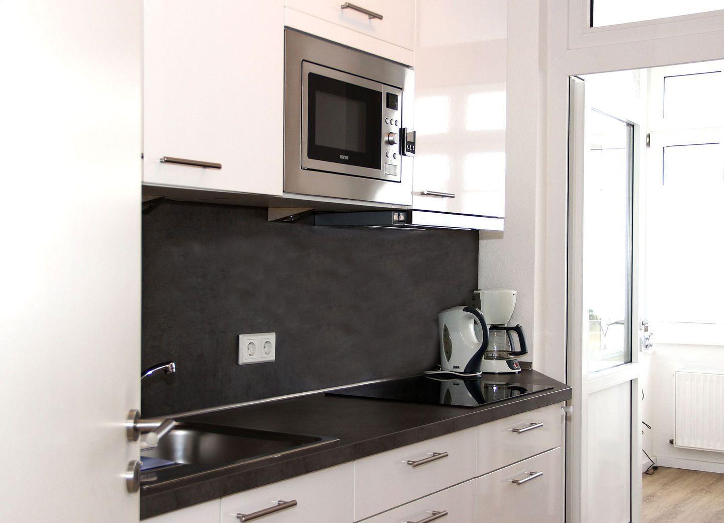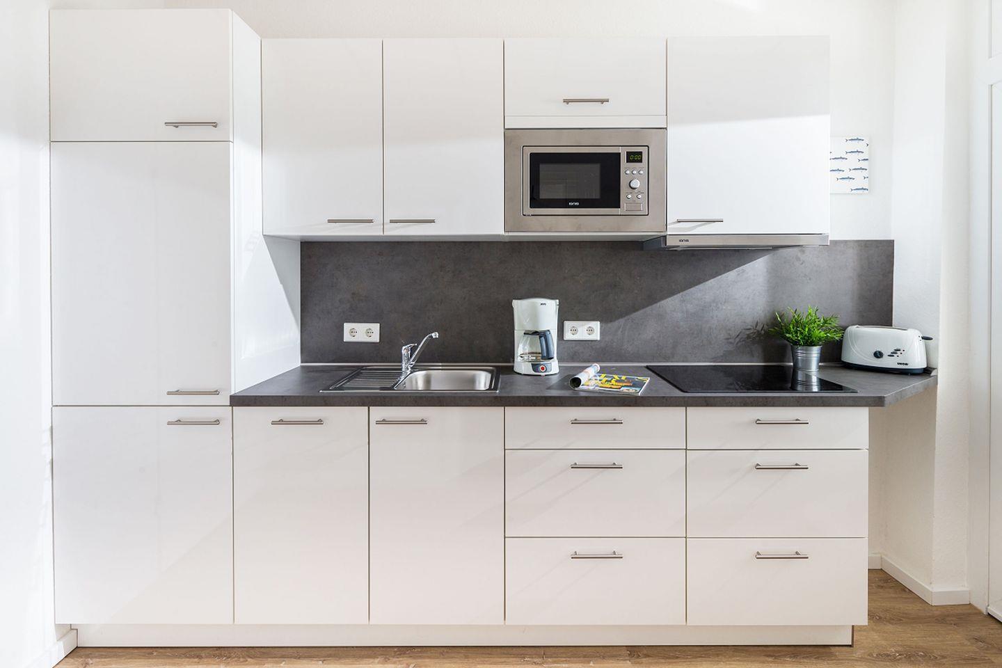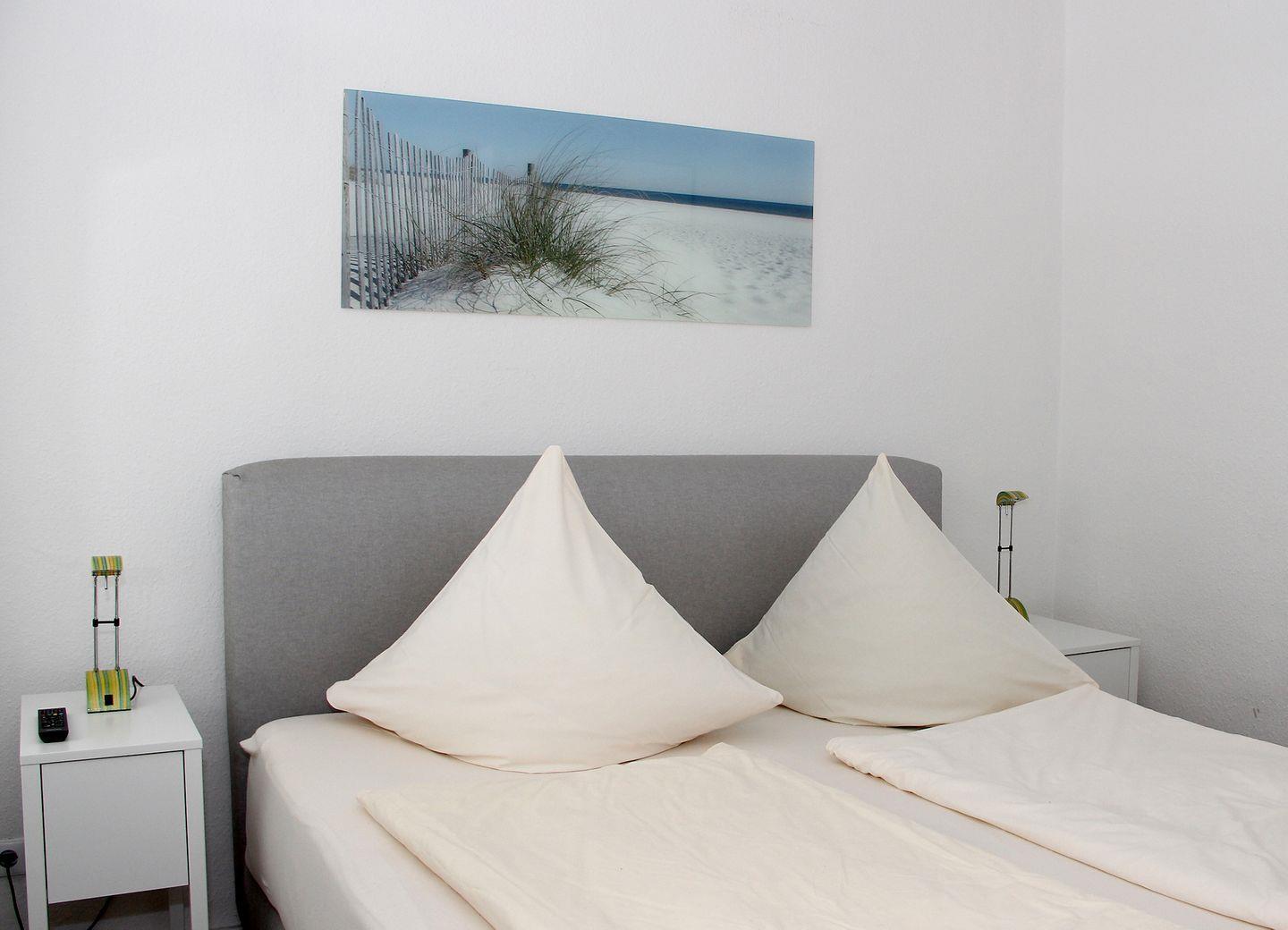 das helle Wohnzimmer vor dem Schlafraum mit Doppelbett (180x200) und zusätzlichem TV-Gerät bietet Platz für eine Ess-und eine Sofaecke. Das separate Schlafzimmer verfügt über ein Etagenbett (90x200) und kleinem Schreibtisch mit Sitzgelegenheit. Modernes Badezimmer mit Dusche/WC. Die offene Küchenzeile ist voll ausgestattet.