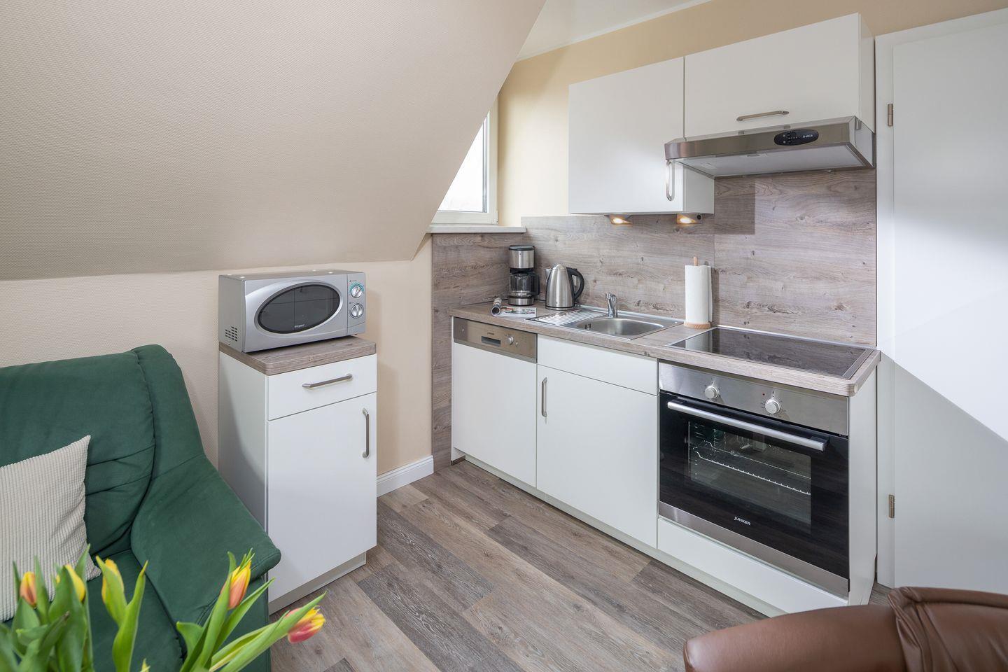 die Ferienwohnung im 1. OG verfügt über ein separates Schlafzimmer mit Doppelbett, Wohnraum mit vollausgestatteter Küchenzeile und Essecke sowie über ein Tageslichtbad mit Dusche/WC. Der wohnungseigene Parkplatz ist in Hausnähe im Kiefernweg. Im Haus befinden sich 2 Ferienwohnungen, Lebensmittelgeschäfte mit Bäcker in 350m Entfernung.