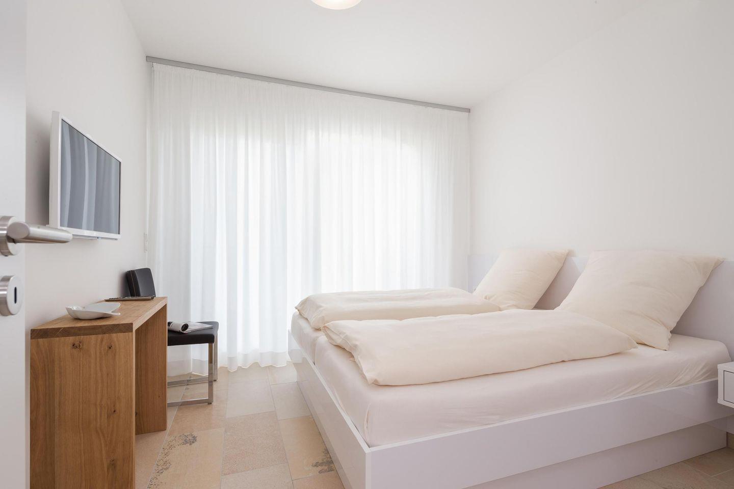 Wohnraum mit Küchenzeile, Essplatz und Sofaecke direkt an den Terrassenfenstern zum Balkon. Beide separate Schlafzimmer sind ausgestattet mit Doppelbett und haben zusätzlich TV. Der Balkon Richtung offene Nordsee ist sowohl vom Wohnzimmer als auch von einem der beiden Schlafzimmer zu begehen. Tageslichtbad mit Dusche/WC. Fahrstuhl vorhanden.