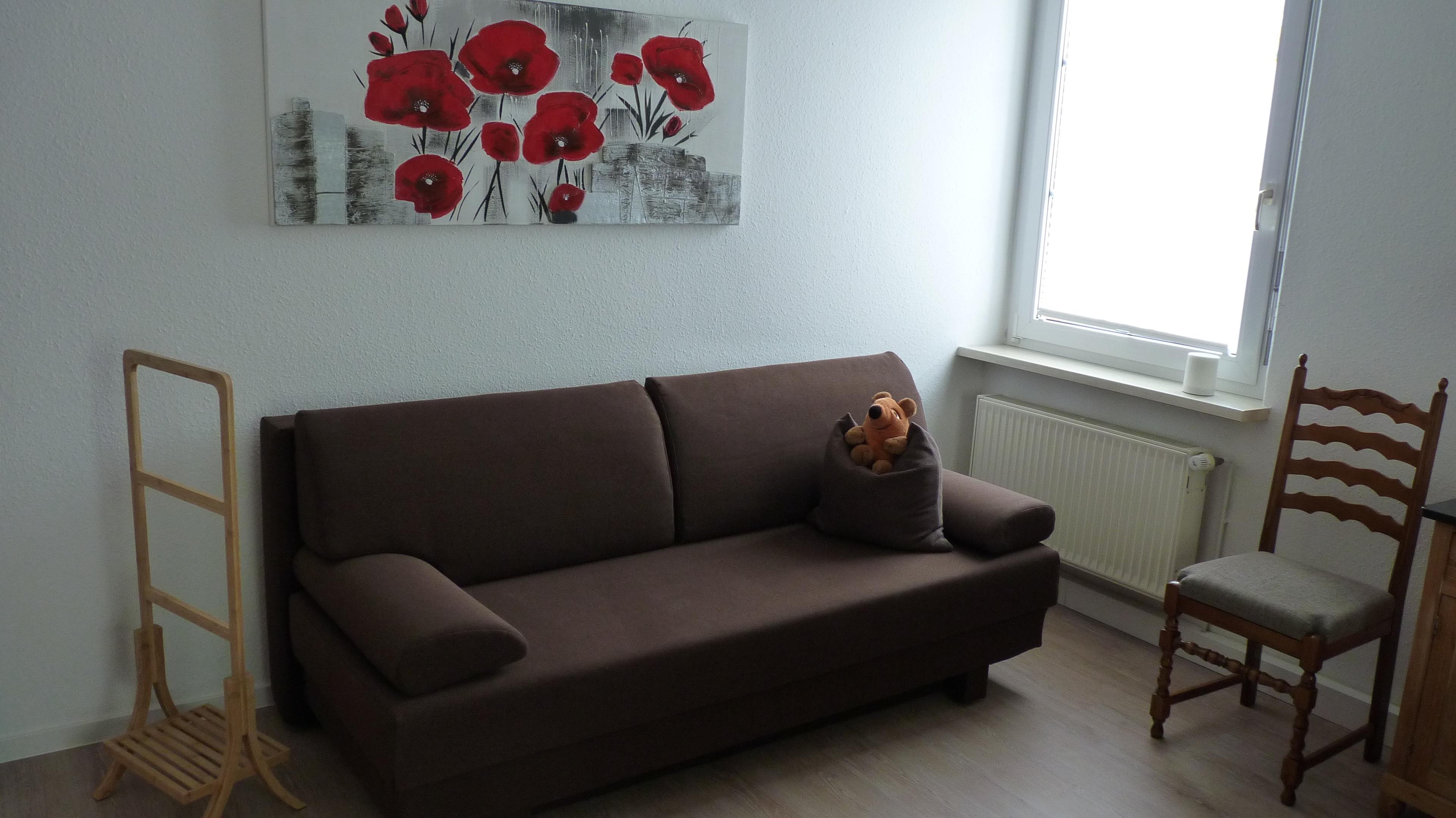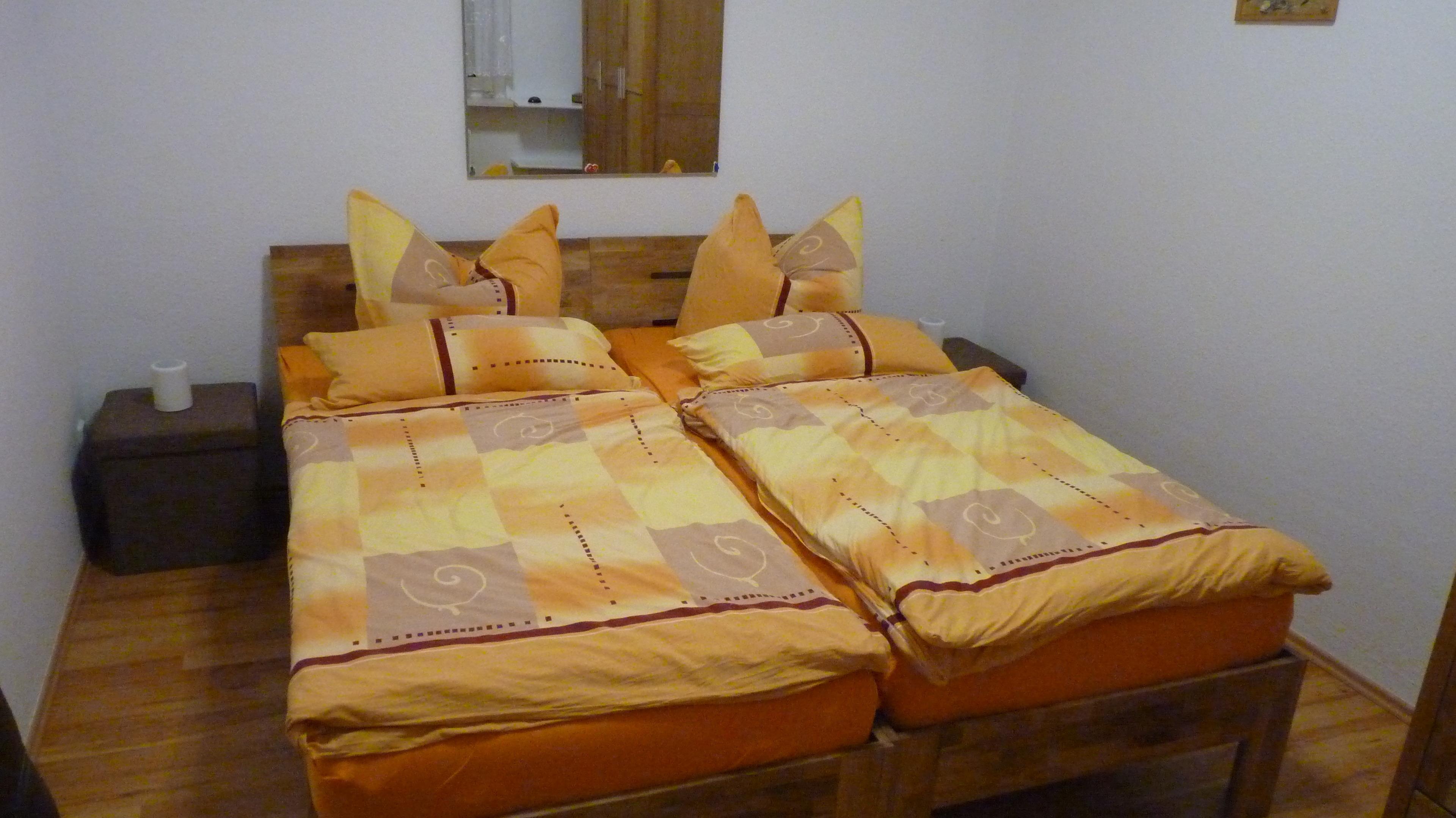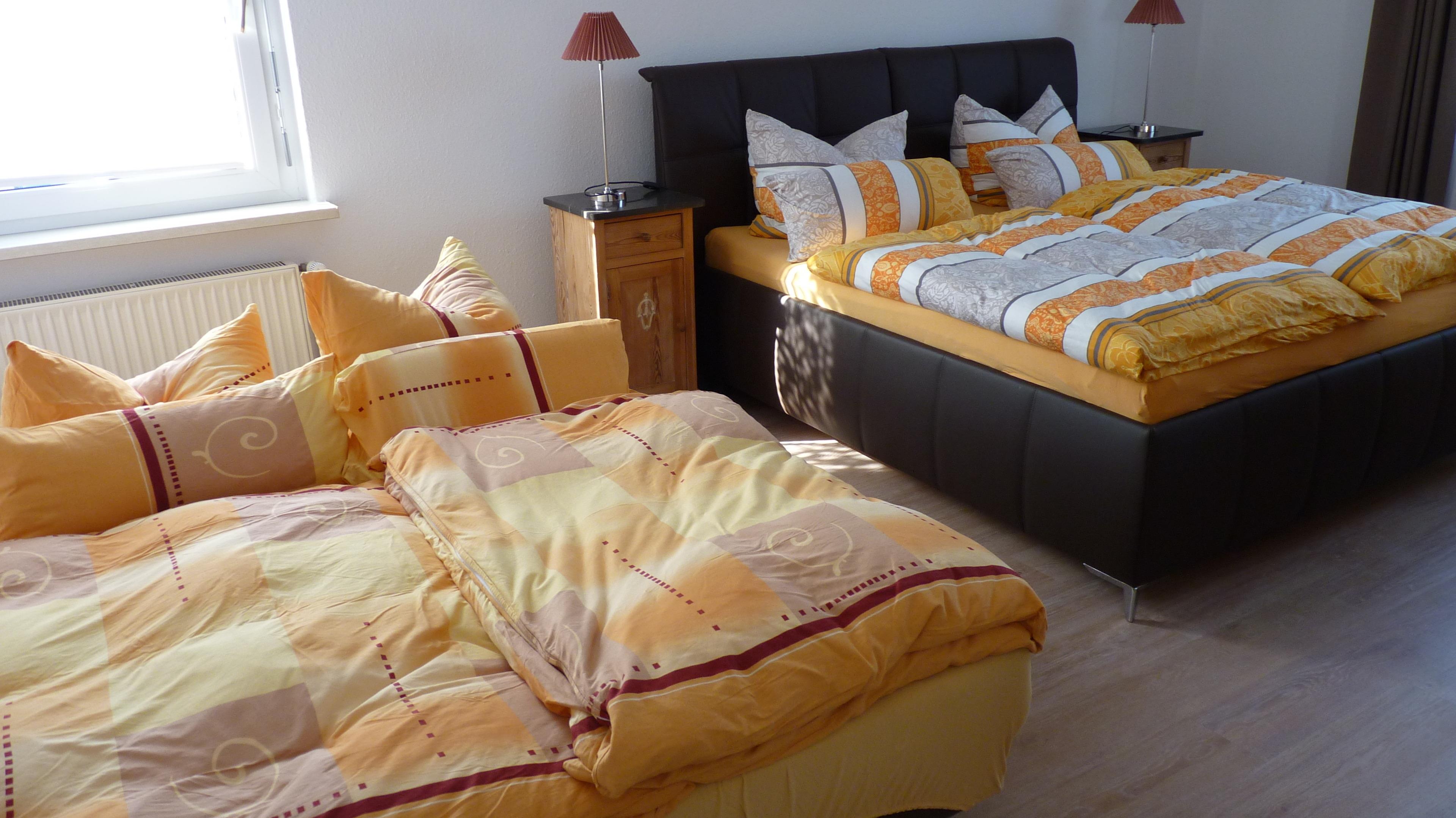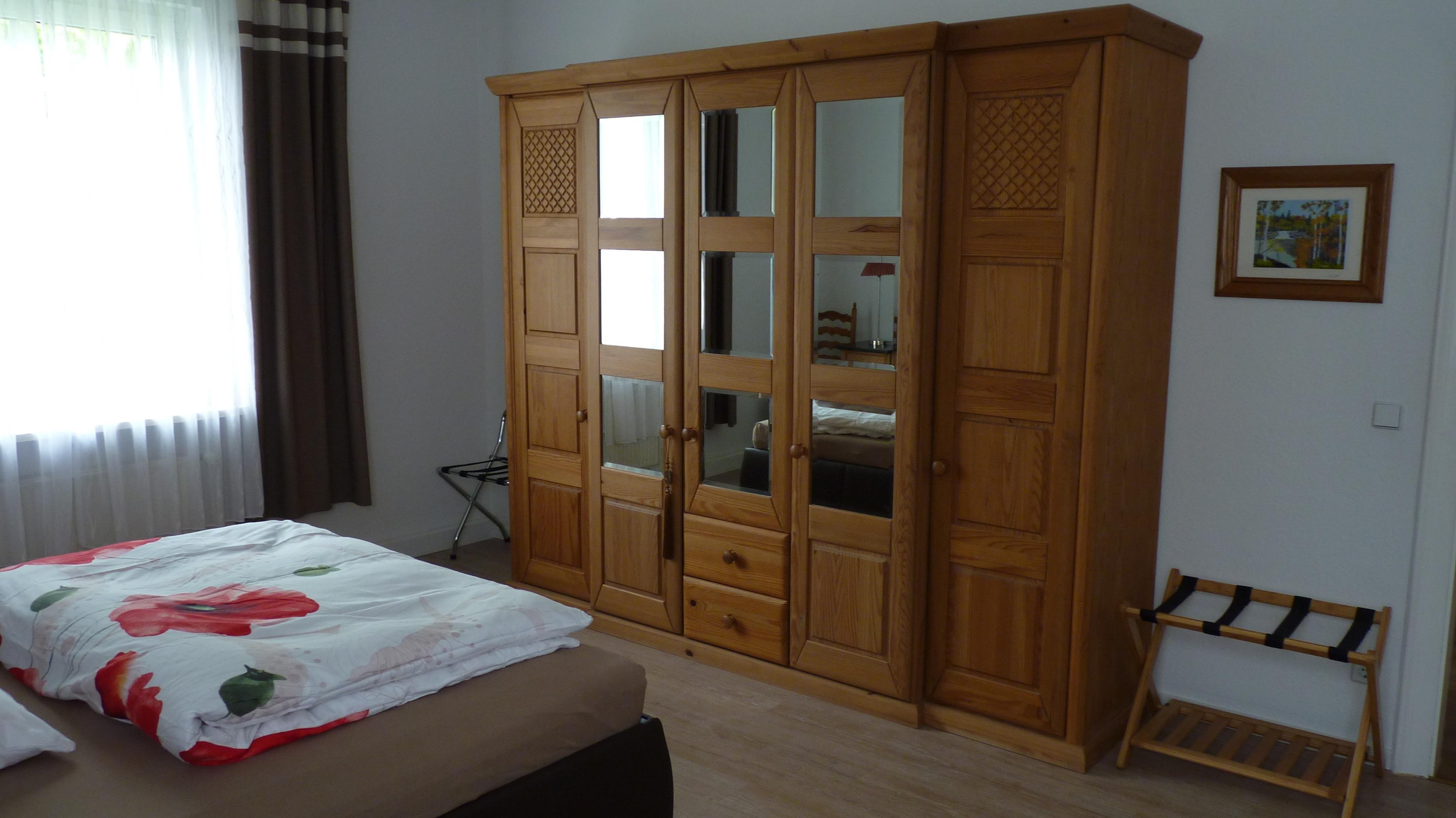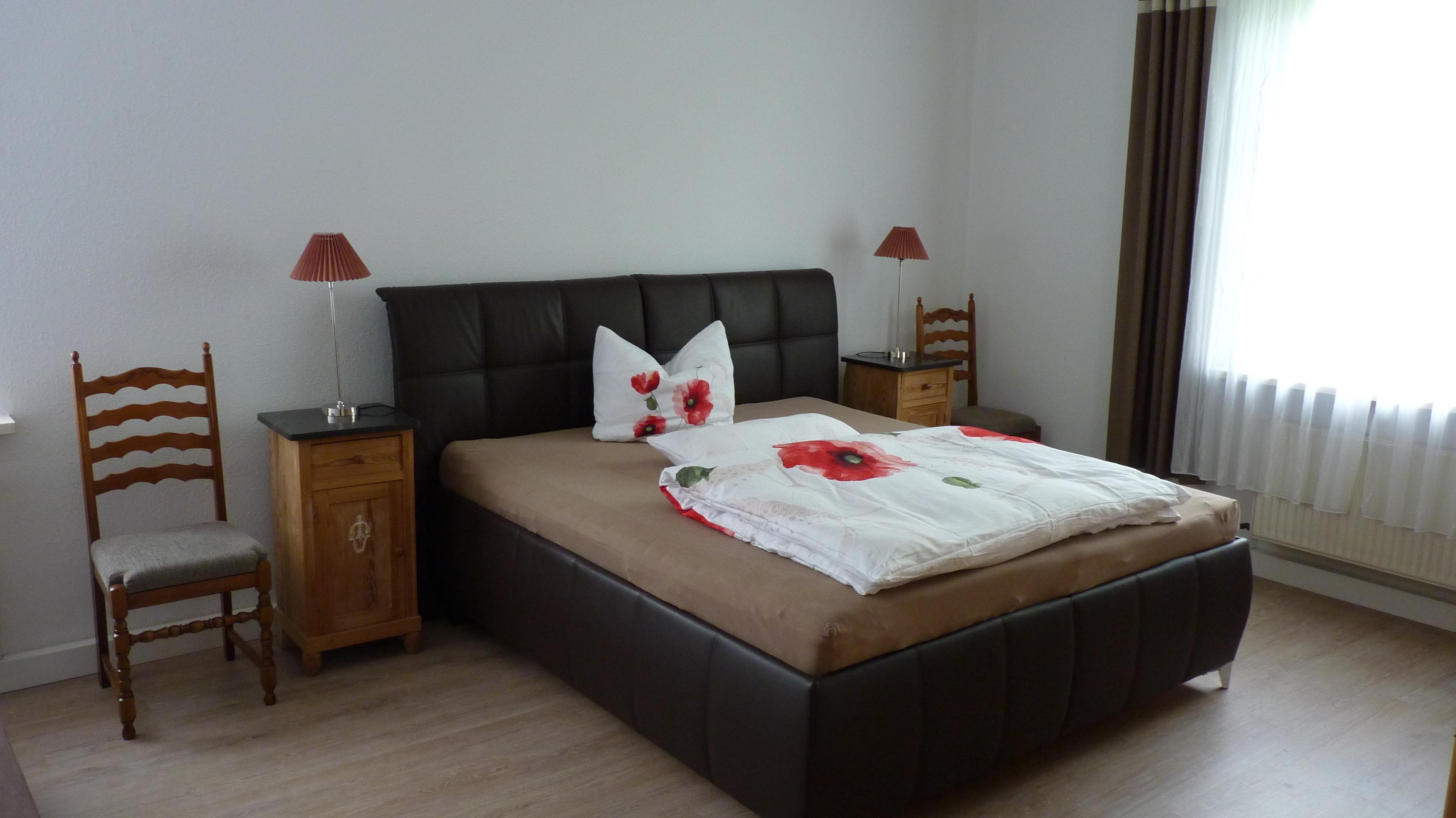 In einem großzügigen Schlafzimmer mit großem Doppelbett (190 cm x 200 cm), großem Garderobenschrank, 2 Nachtschränken, Schlafcouch sowie 2 Stühlen können maximal 4 Personen übernachten.