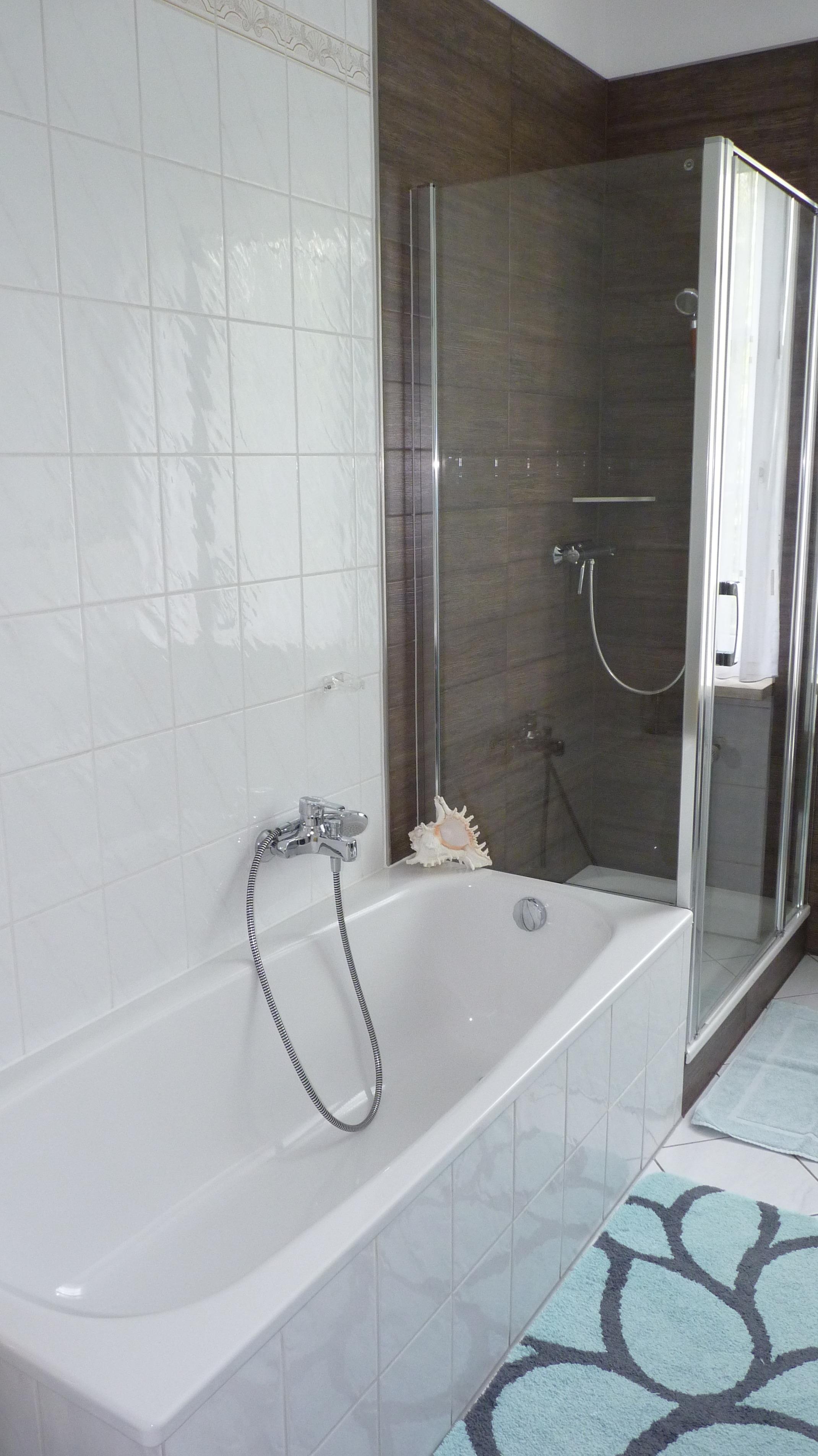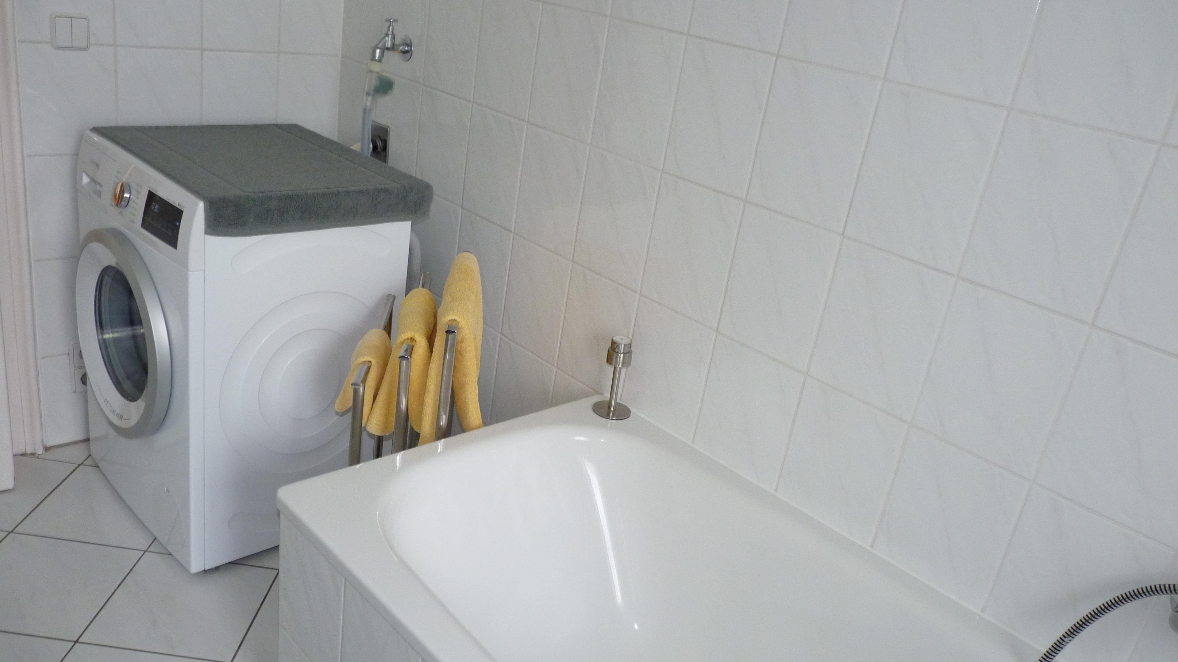 Im Badezimmer befinden sich eine Dusche und Badewanne, ein Waschtisch sowie das WC und eine Waschmaschine.