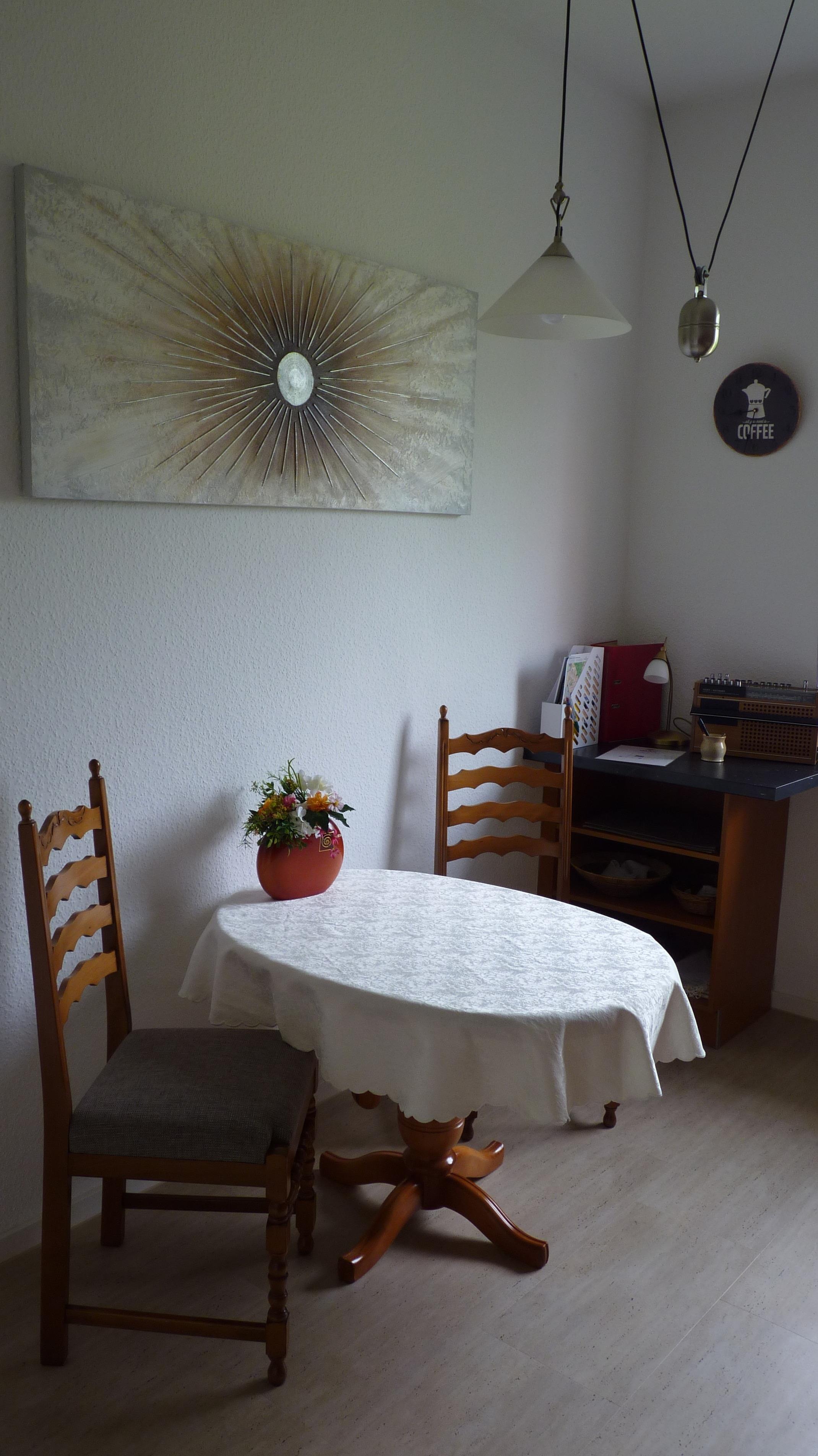 Der große helle Wohnbereich mit Wohn- und Speisezimmer (trennbar durch große Glasschiebetür) sowie großzügigem Balkon lädt zur Entspannung ein. Von hier haben Sie einen fantastischen Ausblick auf das Kunsthaus Meyenburg. Das Sofa lässt sich als Schlafsofa (1,90 mx 1,60 m) für 2 Personen ausziehen. Zur Ausstattung gehören auch ein 49"Prime; Ultra-HD Smart-TV, ein antikes Buffet sowie ein historisches Grammophon. Im Speisezimmer können bequem 8 Personen sitzen.