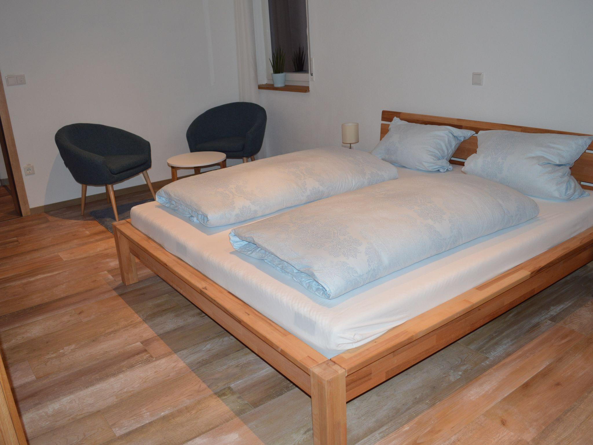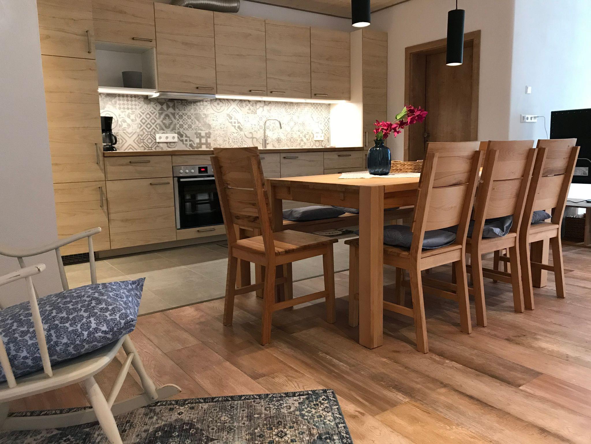 Die ebenerdige Ferienwohnung Hermann ist gemütlich eingerichtet mit ca. 100 qm Wohnraum für bis zu 6 Personen. Es gibt zwei separate Schlafzimmer. Im großzügigen Wohn-, Esszimmer befindet sich eine Schlafcouch als Übernachtungsmöglichkeit für weitere 2 Personen. Die Küchenzeile ist ausgestattet mit Kühlschrank, E-Herd, Backröhre, Spülmaschine, Mikrowelle, Kaffeemaschine, Eierkocher und Toastautomat. Es gibt eine separate Dusche und ein Badezimmer mit WC und Waschbecken. Alle Räume können gut mit dem Rollator befahren werden. Weiterhin hat die Wohnung einen Farb-TV mit Sat-Empfang im Wohnzimmer, sowie einen CD Player mit Radio.