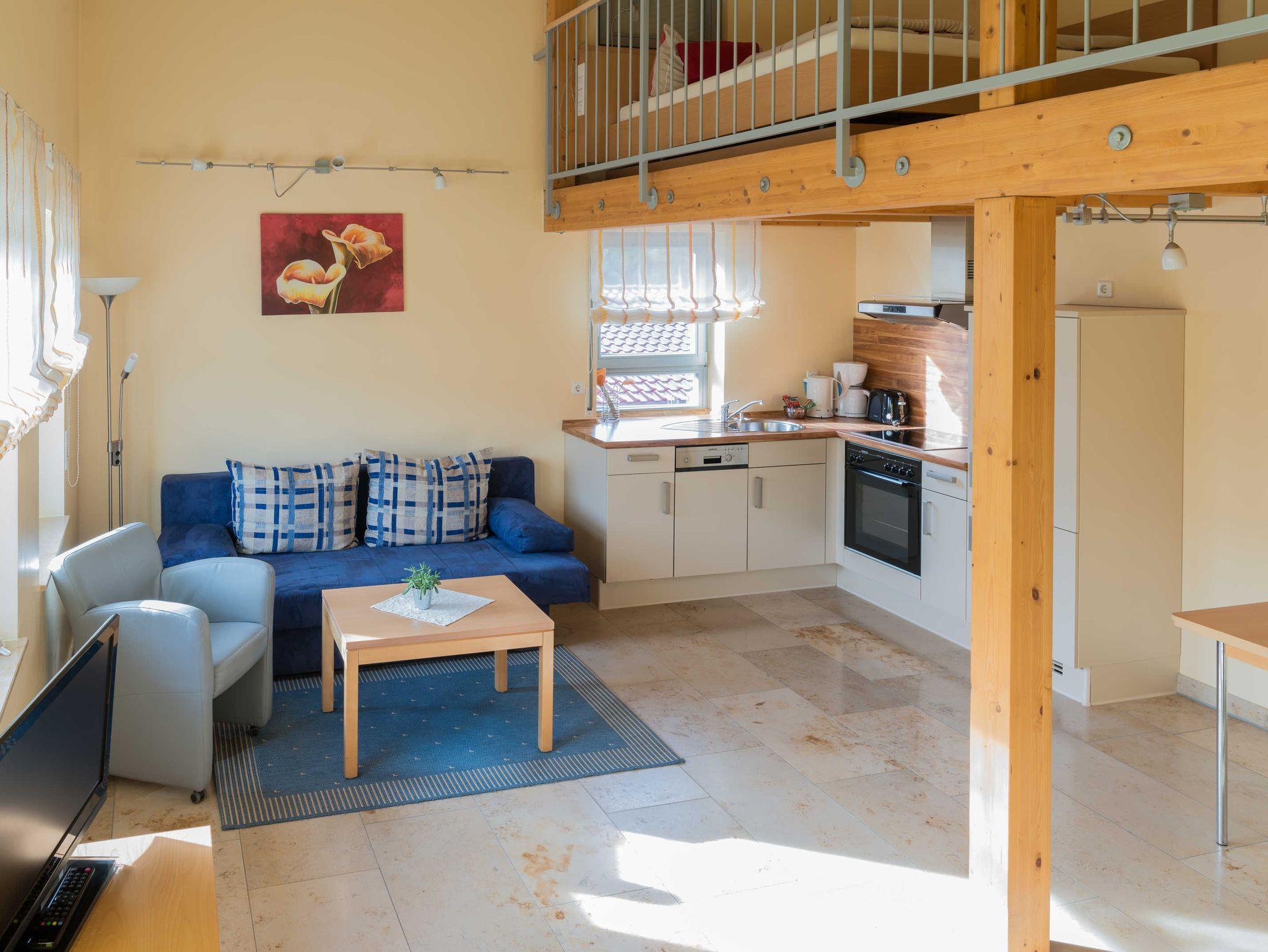Auf der ausklappbaren Couch im Wohnzimmer können zwei weitere Personen schlafen, ein Kinderbett kann auf der Empore zugestellt werden.