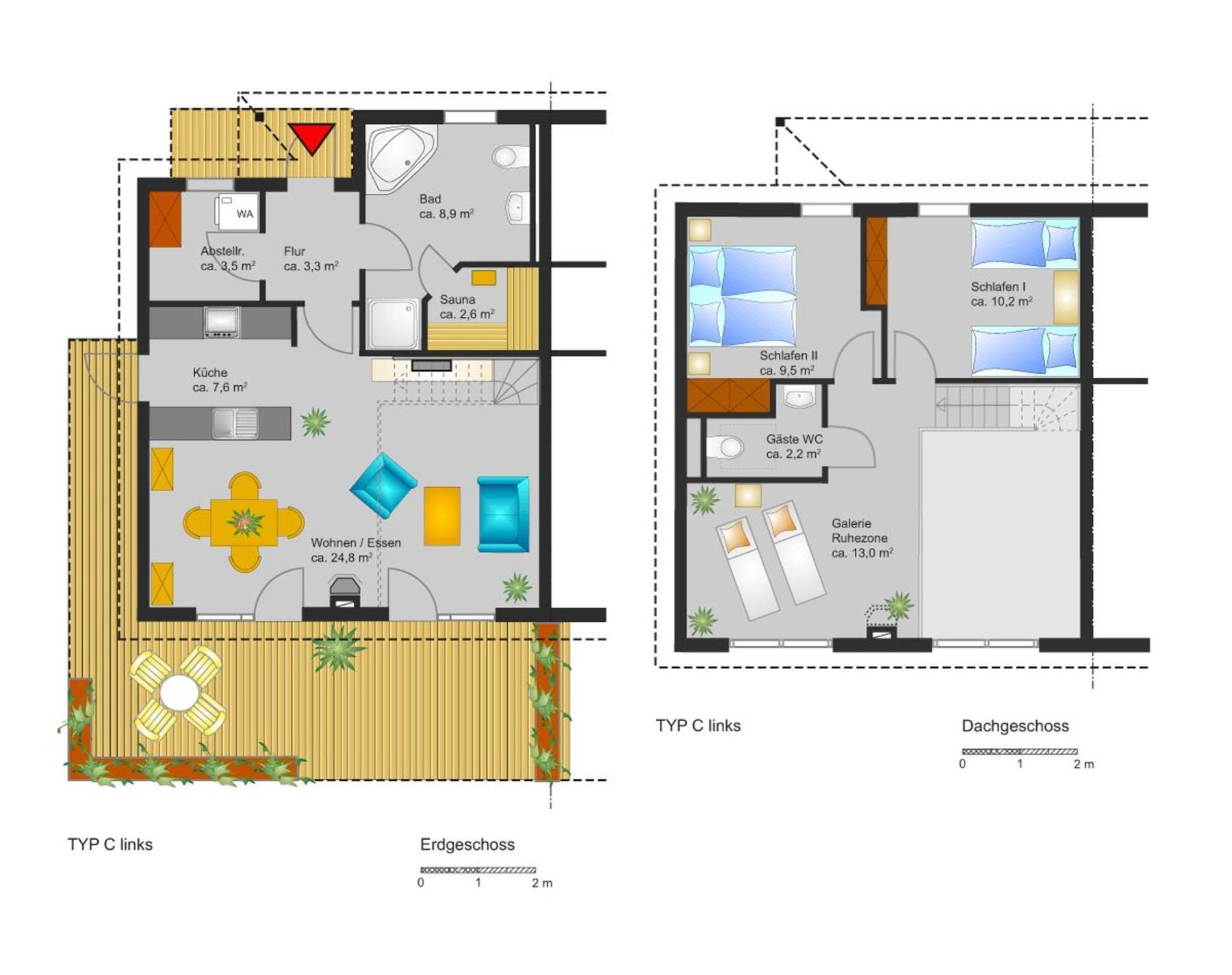Unser Ferienhaus ist hochwertig eingerichtet. Im Erdgeschoss finden Sie einen großzügigen Wohnbereich mit gemütlicher Sitzecke, einen Esstisch für 4 Personen und eine modern eingerichtete Küche, sowie einen kleinen Abstellraum.