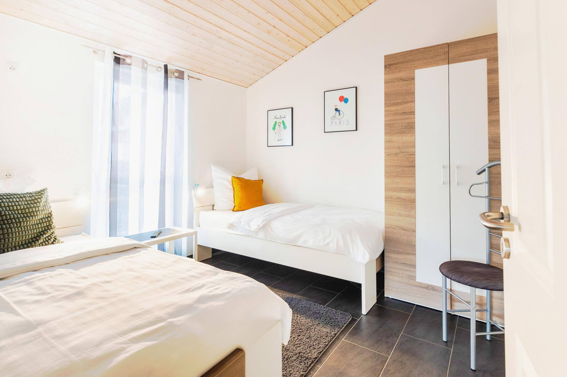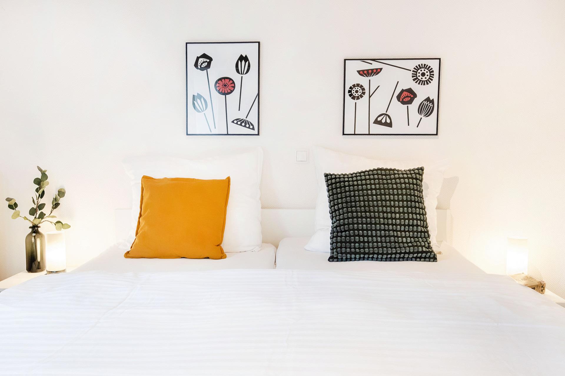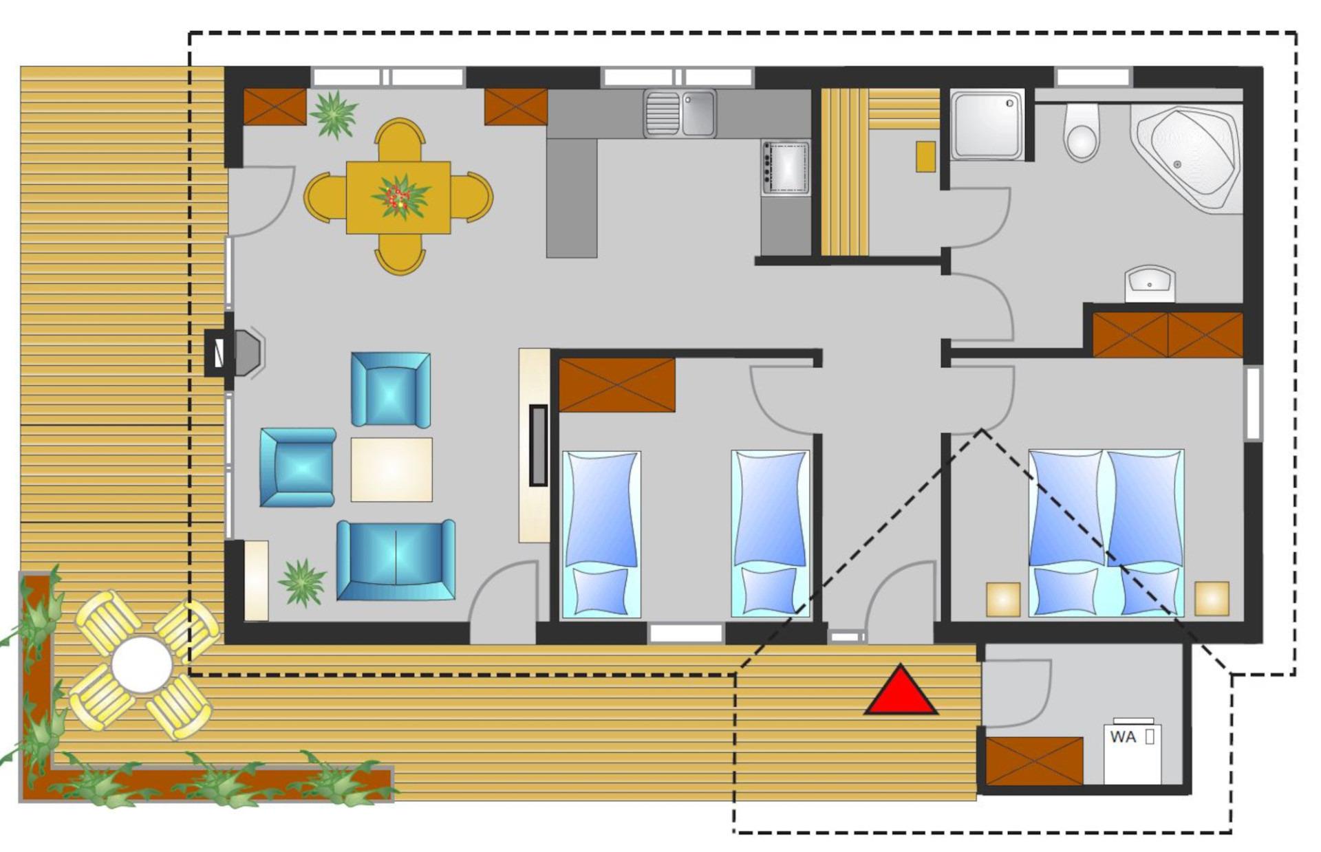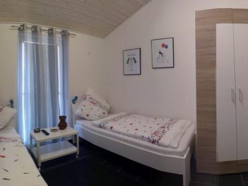 Das Haus verfügt über 2 Schlafzimmer. Eines davon mit Doppelbett (1,80 x 2,00 m), Verdunklungsgardinen und Fernseher, das zweite mit zwei Einzelbetten (0,90 x 2,00 m), ebenfalls mit Verdunklungsgardinen und einem Fernseher.