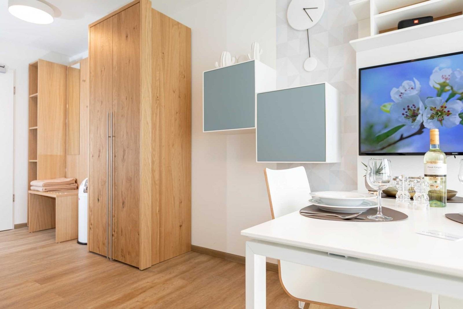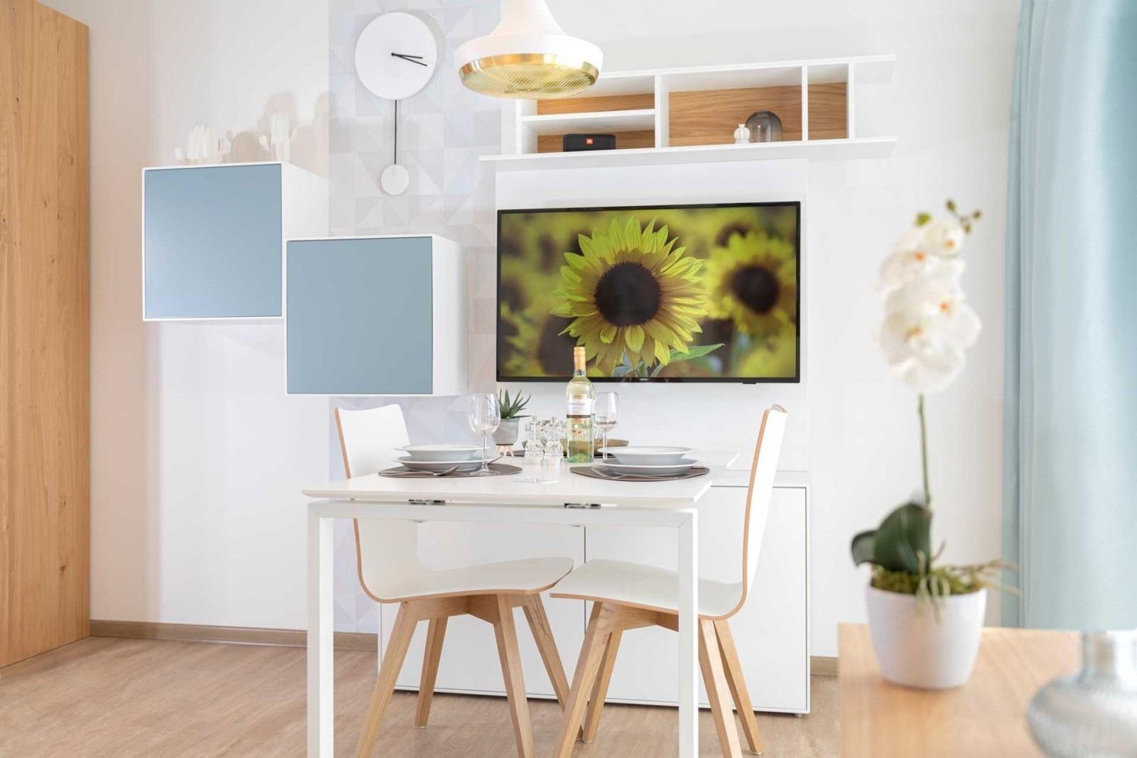 Der Tisch im Essbereich mit 2 Stühlen ist multifunktional und kann durch seine technische Ausstattung auch als Schreibtisch genutzt werden. Ganz selbstverständlich verfügt das Apartment über einen kostenfreien Internetanschluss, einen internetfähigen Smart-TV und ein Bluetooth-Radio.