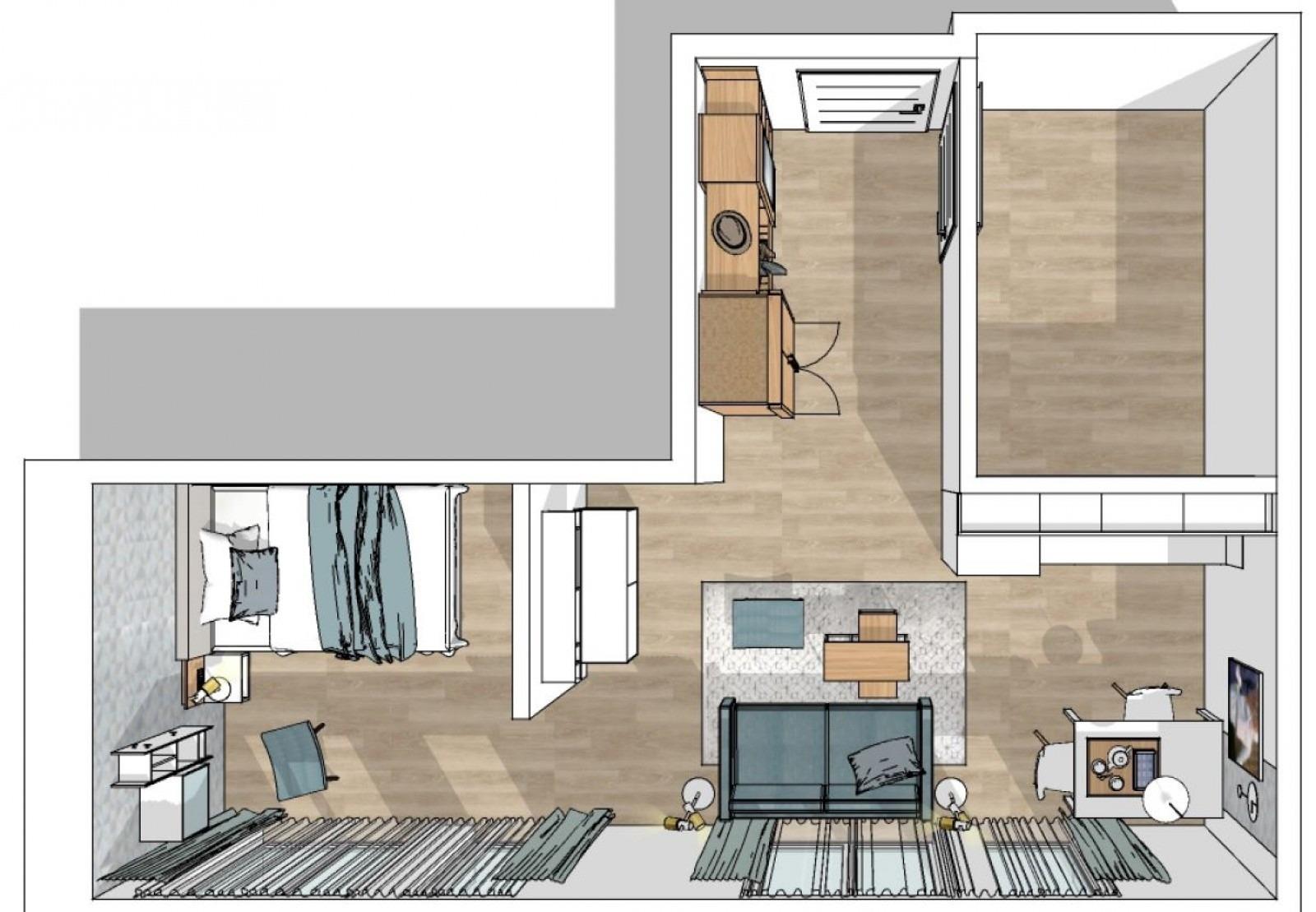 Die Garderobe im Eingangsbereich und der Kleiderschrank, sowie der wohnliche Sitzbereich mit gemütlichem Schlafsofa und Hocker runden die Einrichtung ab.