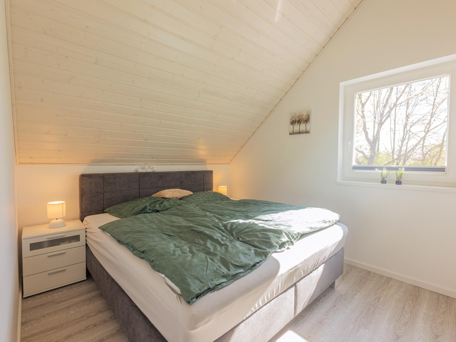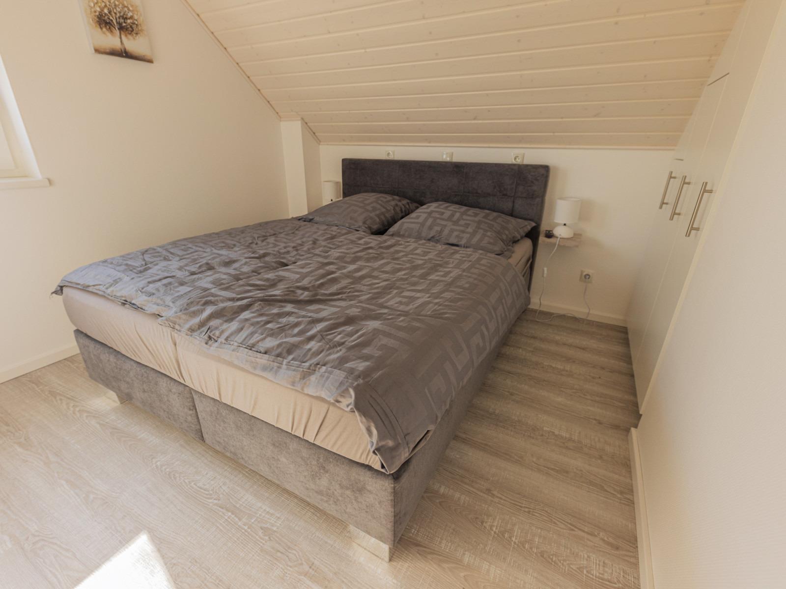 Hier oben befinden sich auch die beiden Schlafzimmer mit Boxspringbetten in den Maßen 1,80 m x 2,00 m und 1,60 m x 2,00 m, die einen entspannten Schlaf garantieren. Eine zusätzliche Schlafmöglichkeit bietet das Schlafsofa im Wohnbereich.