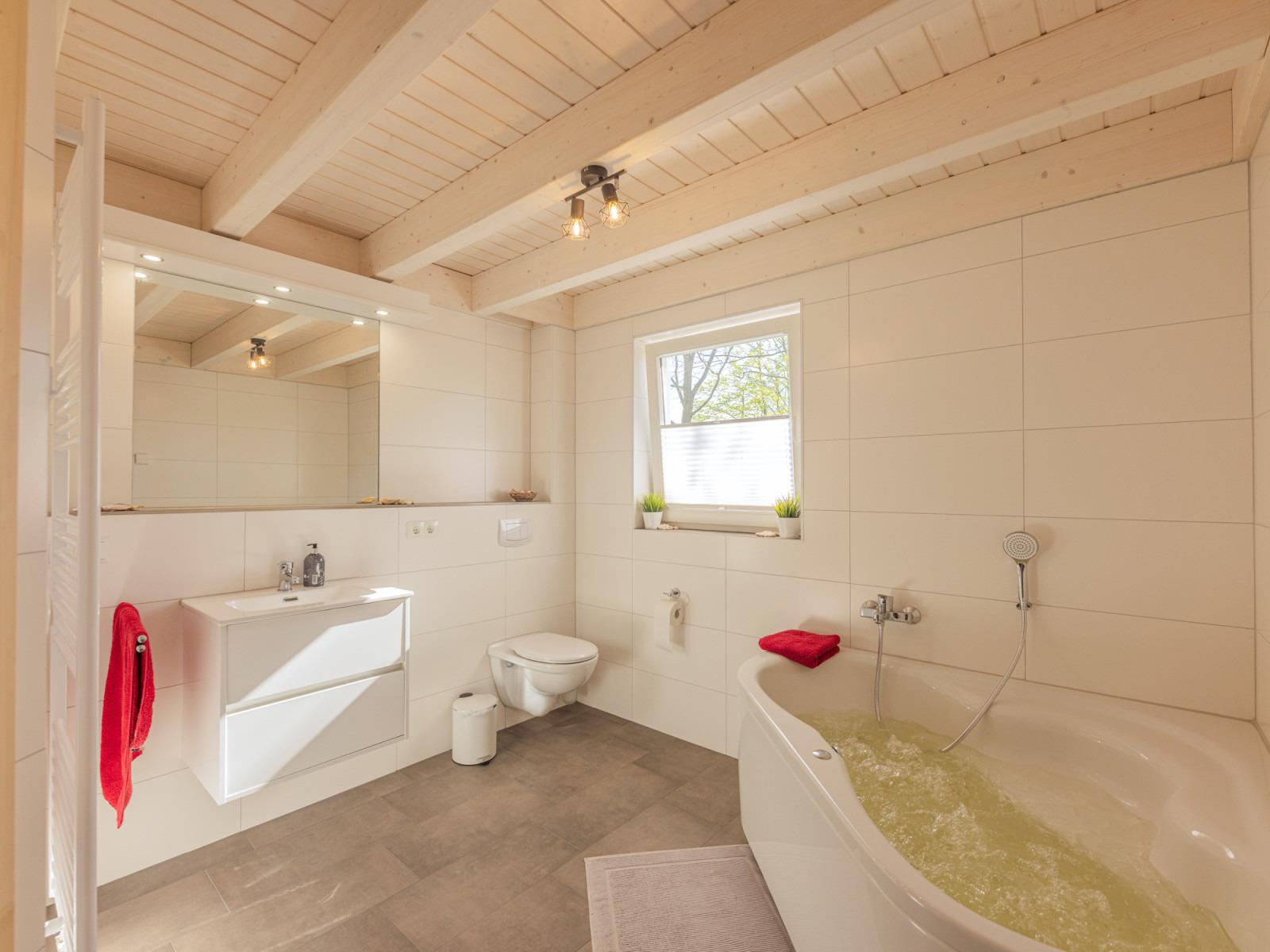 Das große, lichtdurchflutete Wellnessbad im Erdgeschoss verfügt über einen Whirlpool, eine ebenerdige Dusche und eine Sauna, in der Sie die Seele baumeln lassen können.