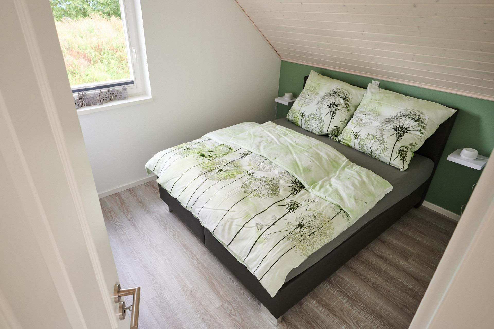 Zudem befinden sich im Obergeschoss beide Schlafzimmer, jeweils mit Boxspringbett, gemütlich eingerichtet und perfekt für erholsame Nächte.