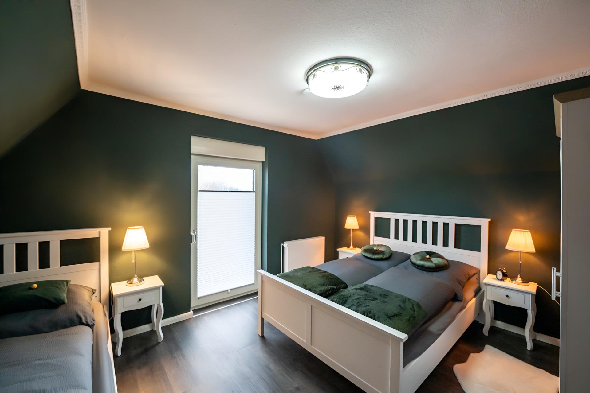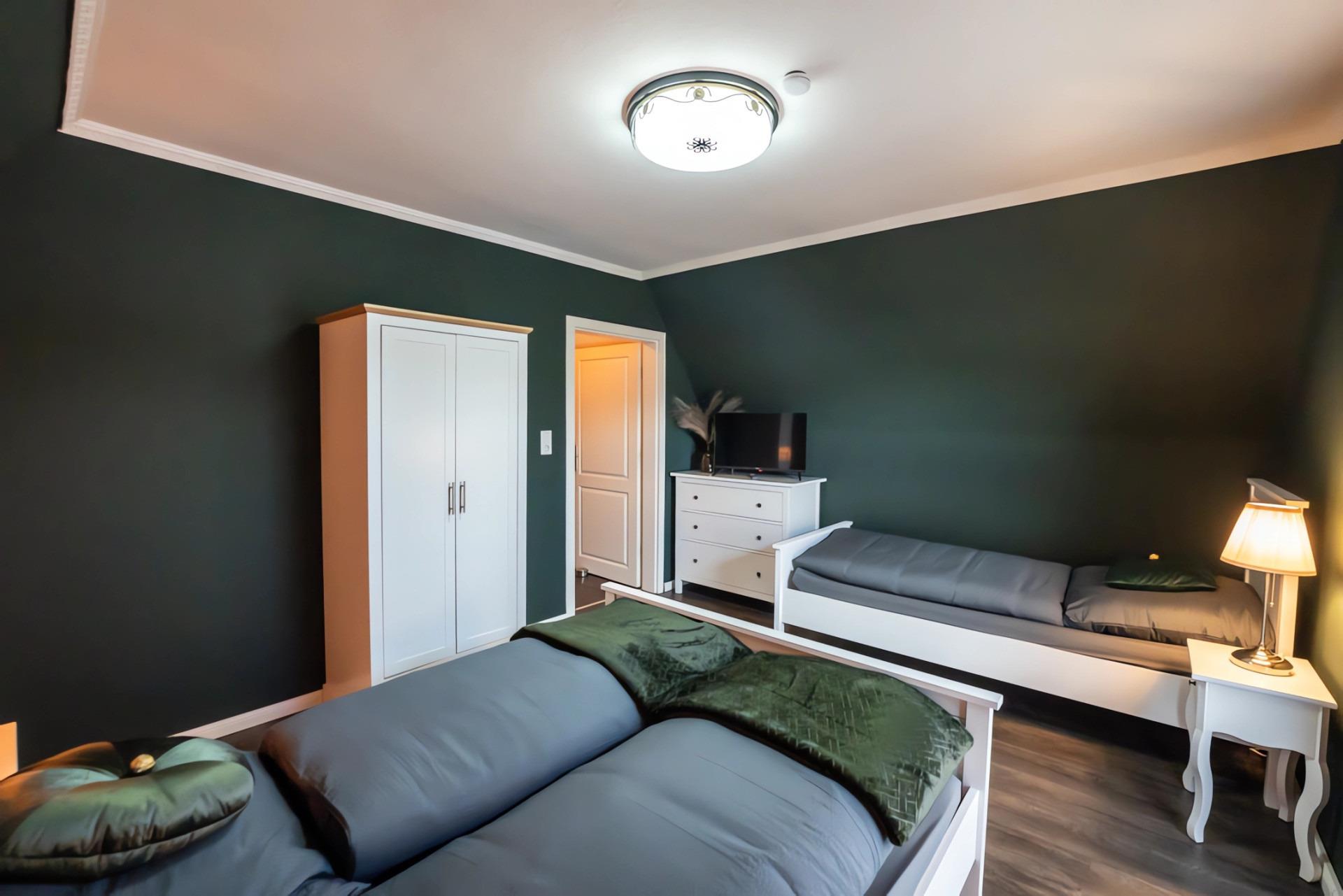 Die Wohnung ist liebevoll eingerichtet und verfügt über zwei Schlafzimmer, das erste mit einem gemütlichen Doppelbett und einem zusätzlichen Einzelbett.