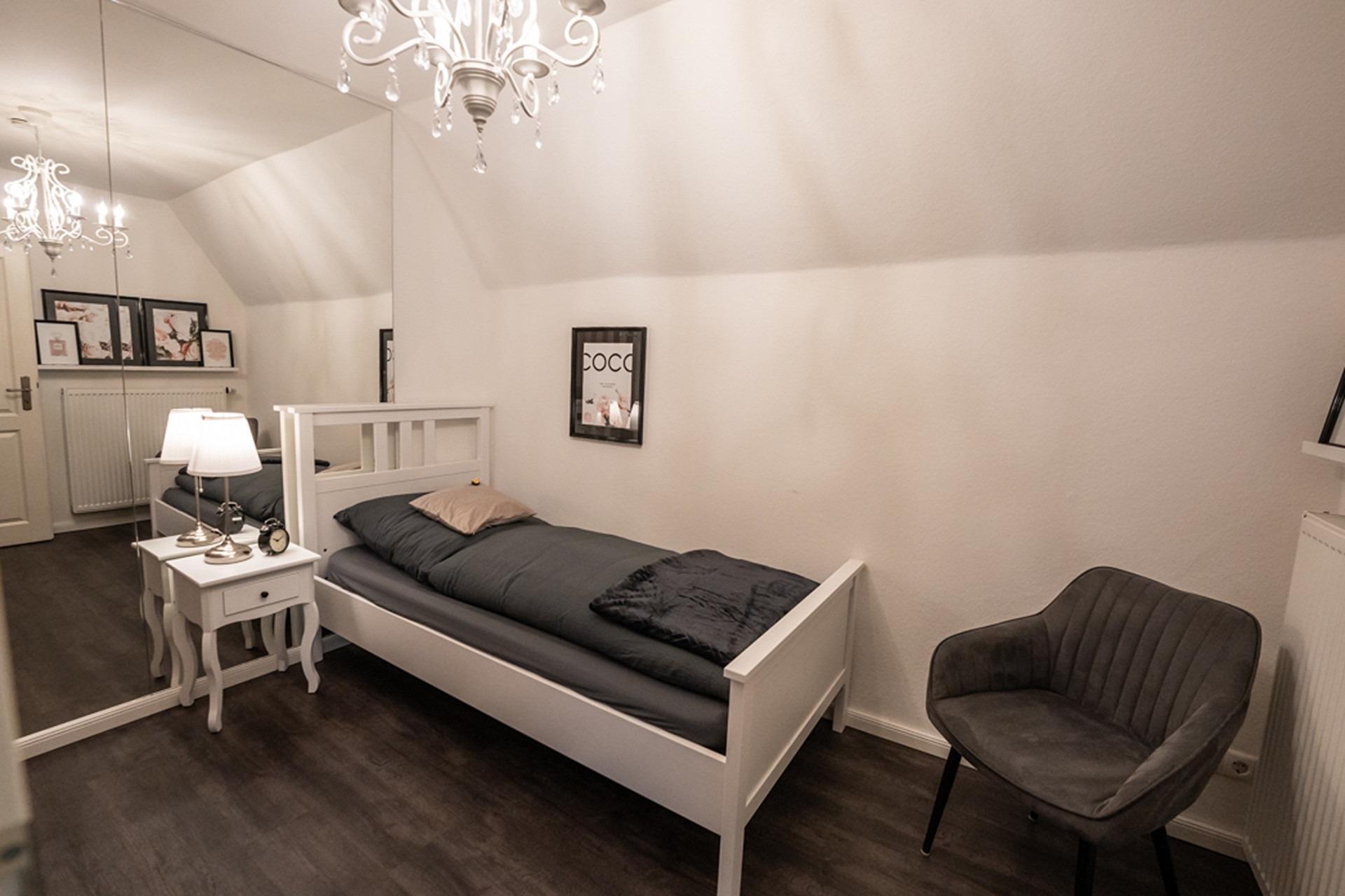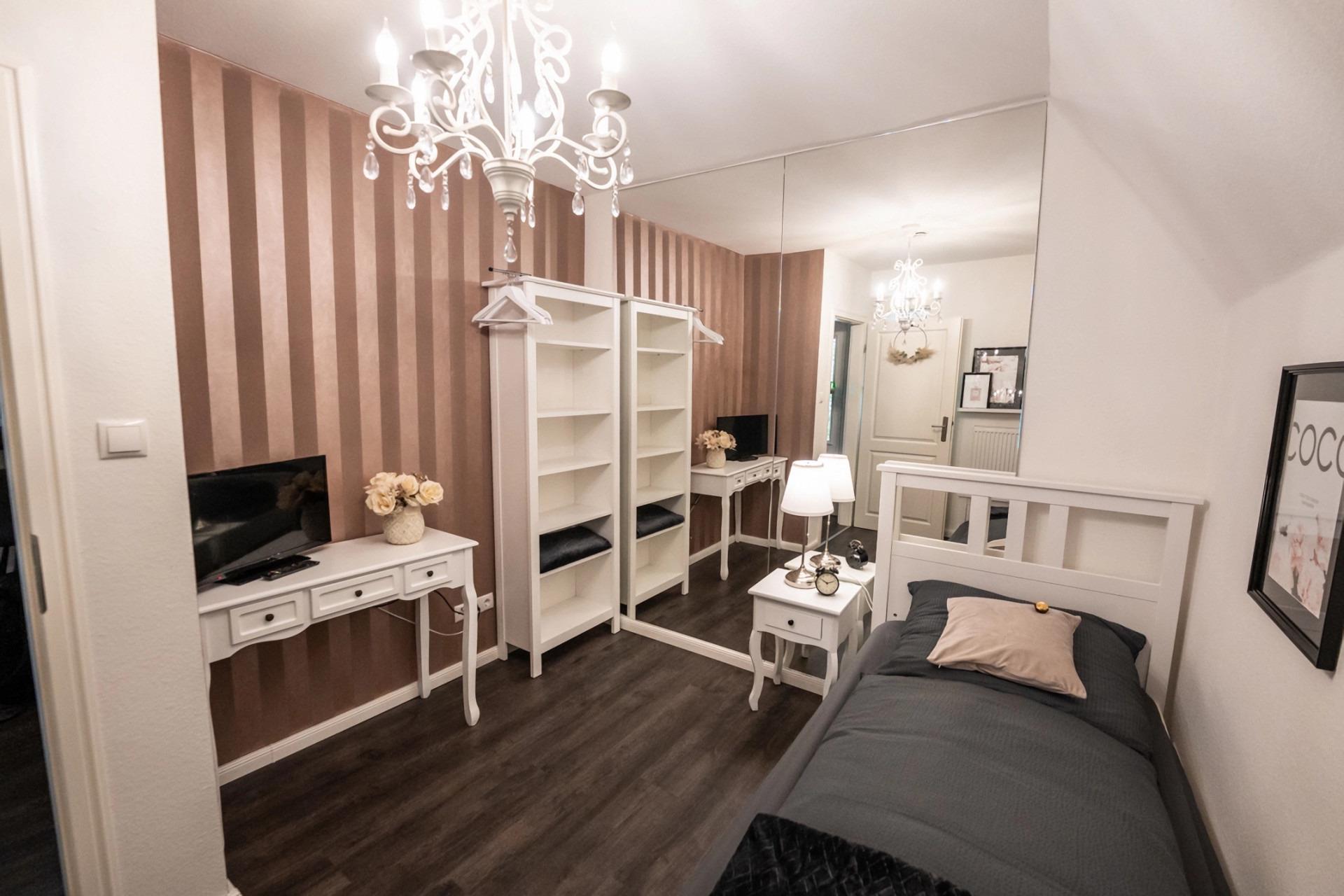 Das zweite Schlafzimmer verfügt über ein Einzelbett, zusätzlich beeindruckt es mit einem großzügigen Wandspiegel. Beide Schlafzimmer sind mit einem TV ausgestattet.