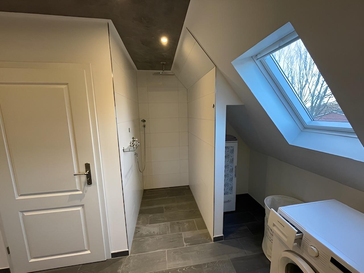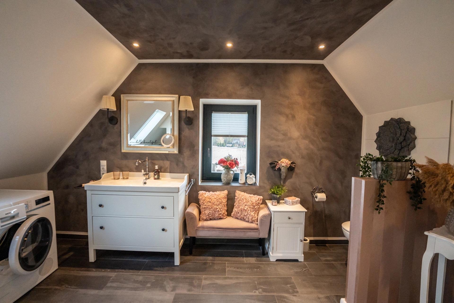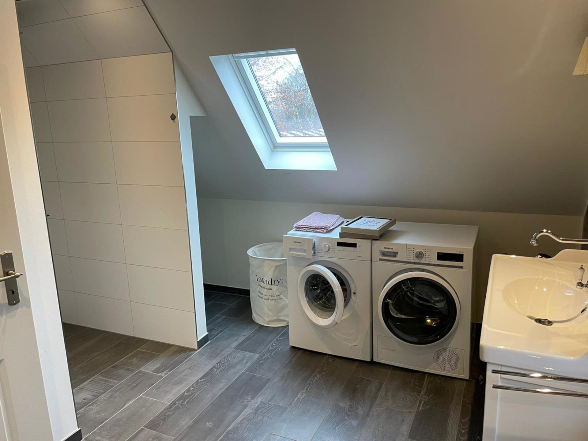 Das Badezimmer verwöhnt mit einem großen Waschtisch, WC, Waschmaschine, Trockner und einer geräumigen Dusche – ein wahrer Wellnessbereich.