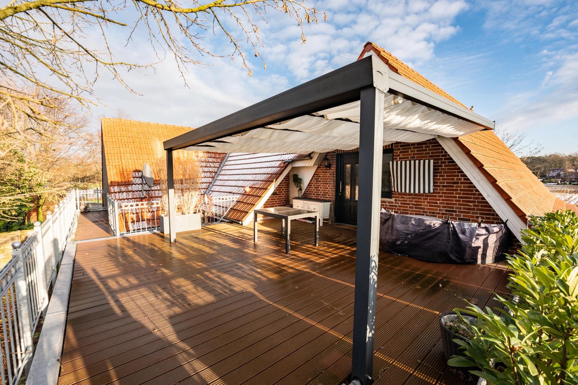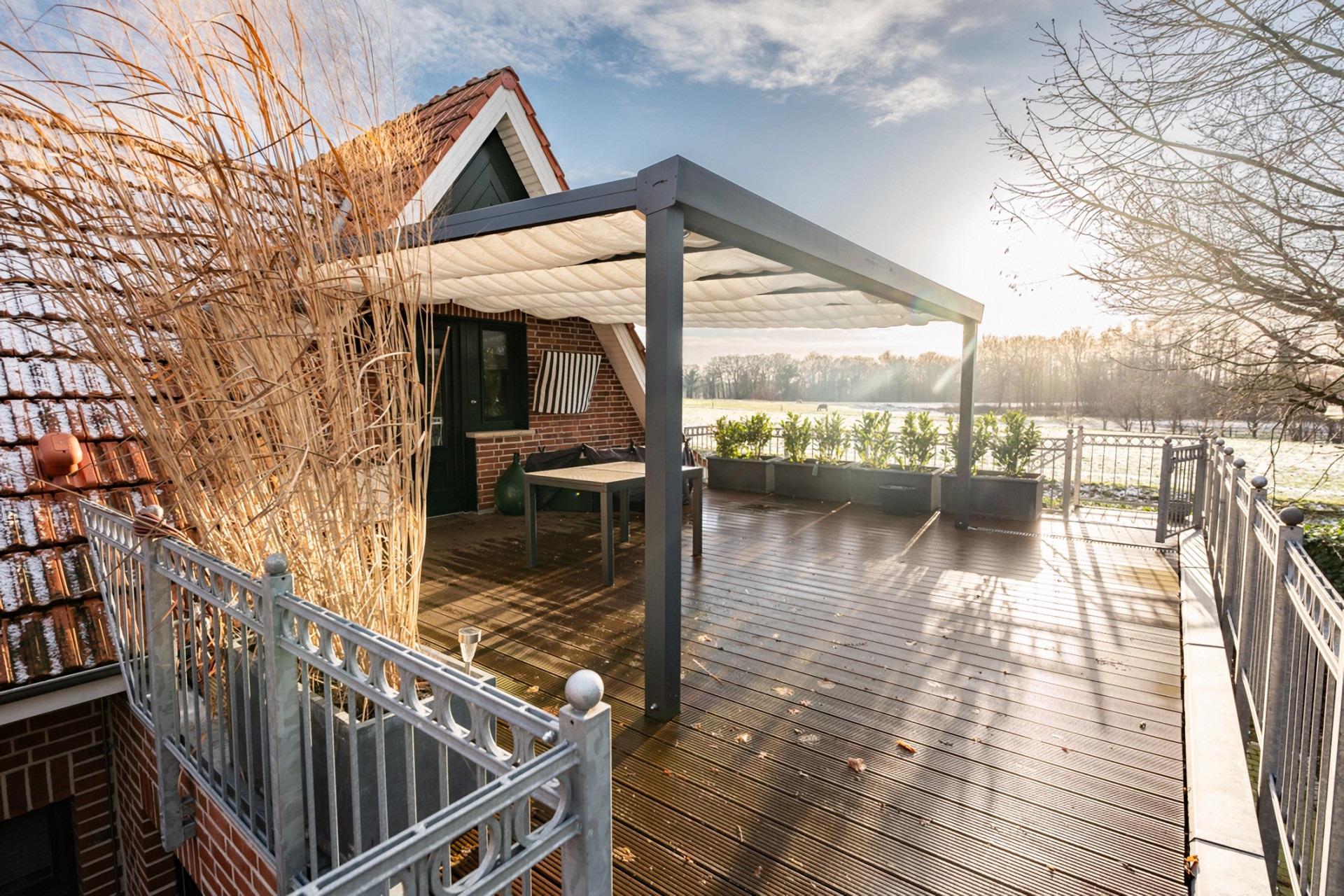Die charmante Ferienwohnung bietet eine große Terrasse mit einem malerischen Blick auf die angrenzenden Felder. Perfekt, um die Seele baumeln zu lassen.