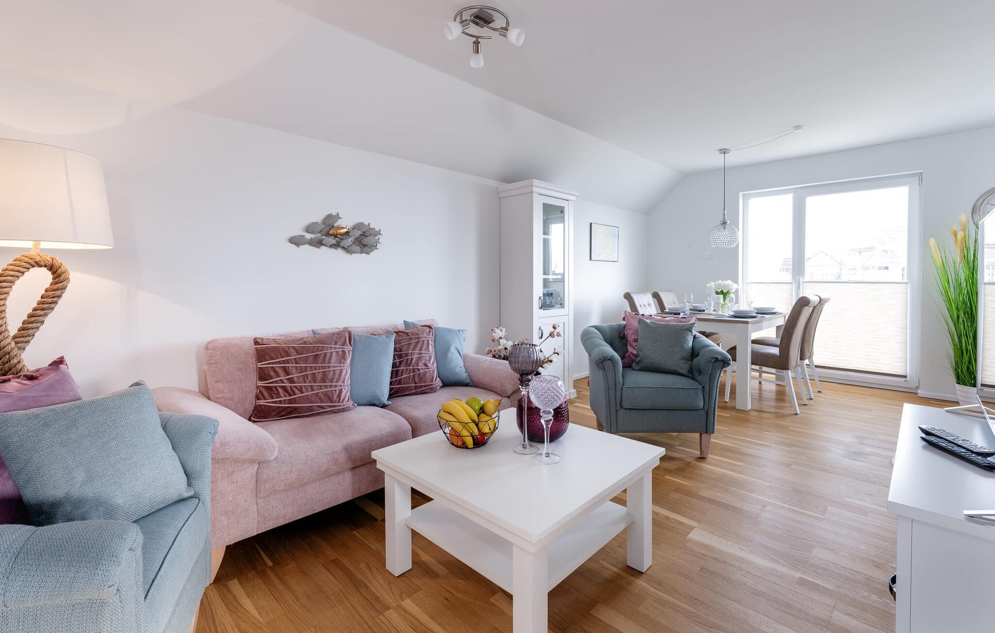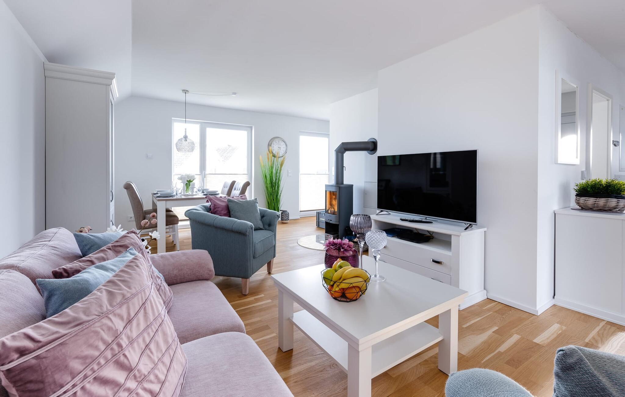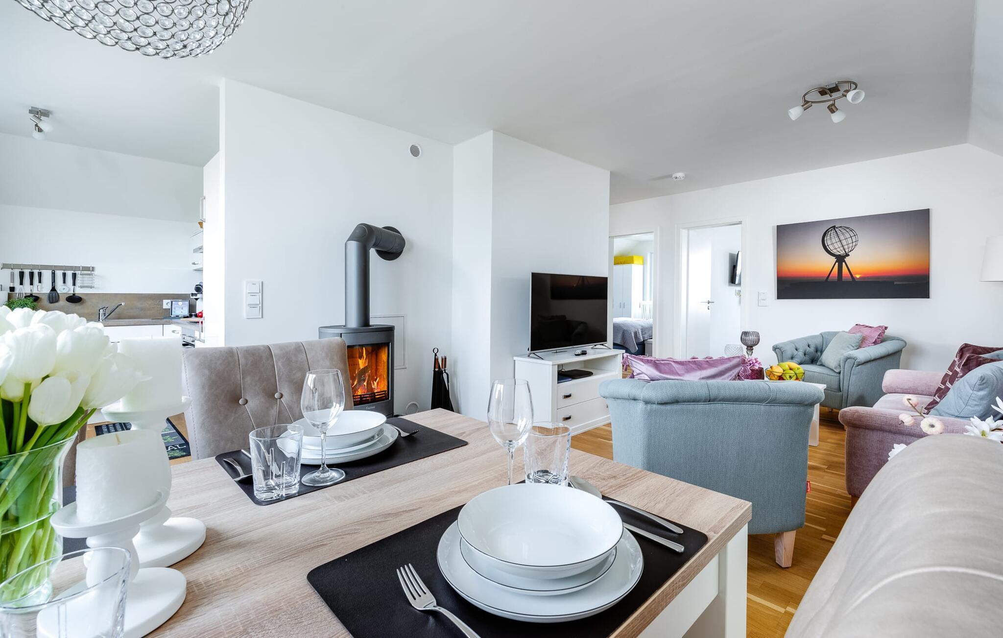 Im Urlaub ist Zeit für kreatives Kochen, die umfangreich ausgestattete Wohnküche lässt hierbei keine Wünsche offen. Direkt an den Essbereich angrenzend liegt die geräumige Sonnenterrasse in Süd-Ost-Lage, auf der zwei Sonnenliegen zur Verfügung stehen. Euch erwartet Sonnengenuss von früh bis spät. Im Wohnbereich steht ein Smart TV mit Telekom Home Entertainment Programm zur Verfügung. Die Wohnung ist mit WLAN ausgestattet, sodass nach Belieben gesurft werden kann.