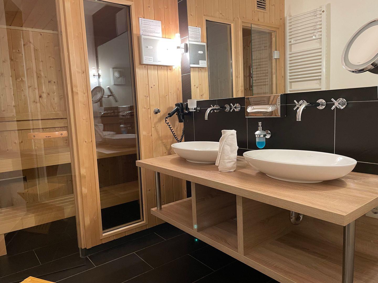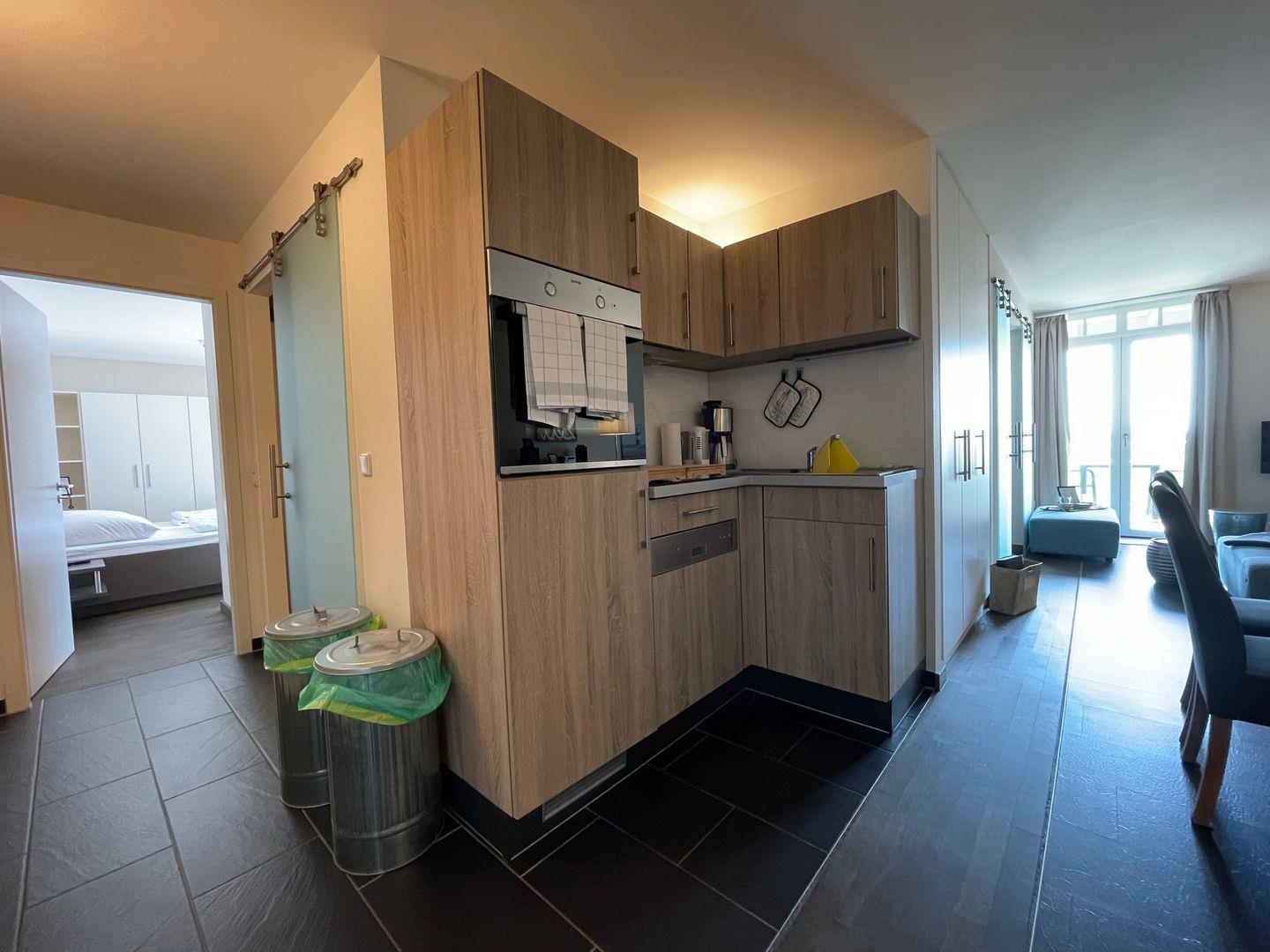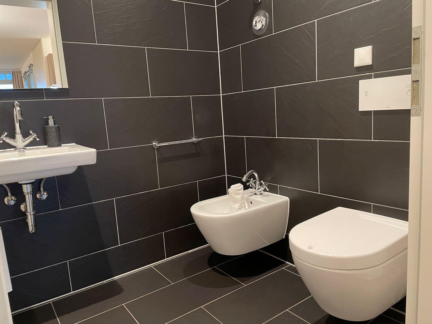 Das hochwertige Badezimmer lässt keine Wünsche offen. Ausgestattet mit einer begehbaren Dusche, Föhn und Kosmetikspiegel sowie der großzügigen eigenen Sauna lässt es sich hier wunderbar entspannen. Die Wohnung beinhaltet ein separates WC mit Bidet und Waschbecken. Das Apartment verfügt über einen Balkon vom dem ihr bis zum Meer und den Hafen sehen könnt. In der Saison steht euch ein Strandkorb am Badestrand zur Verfügung.