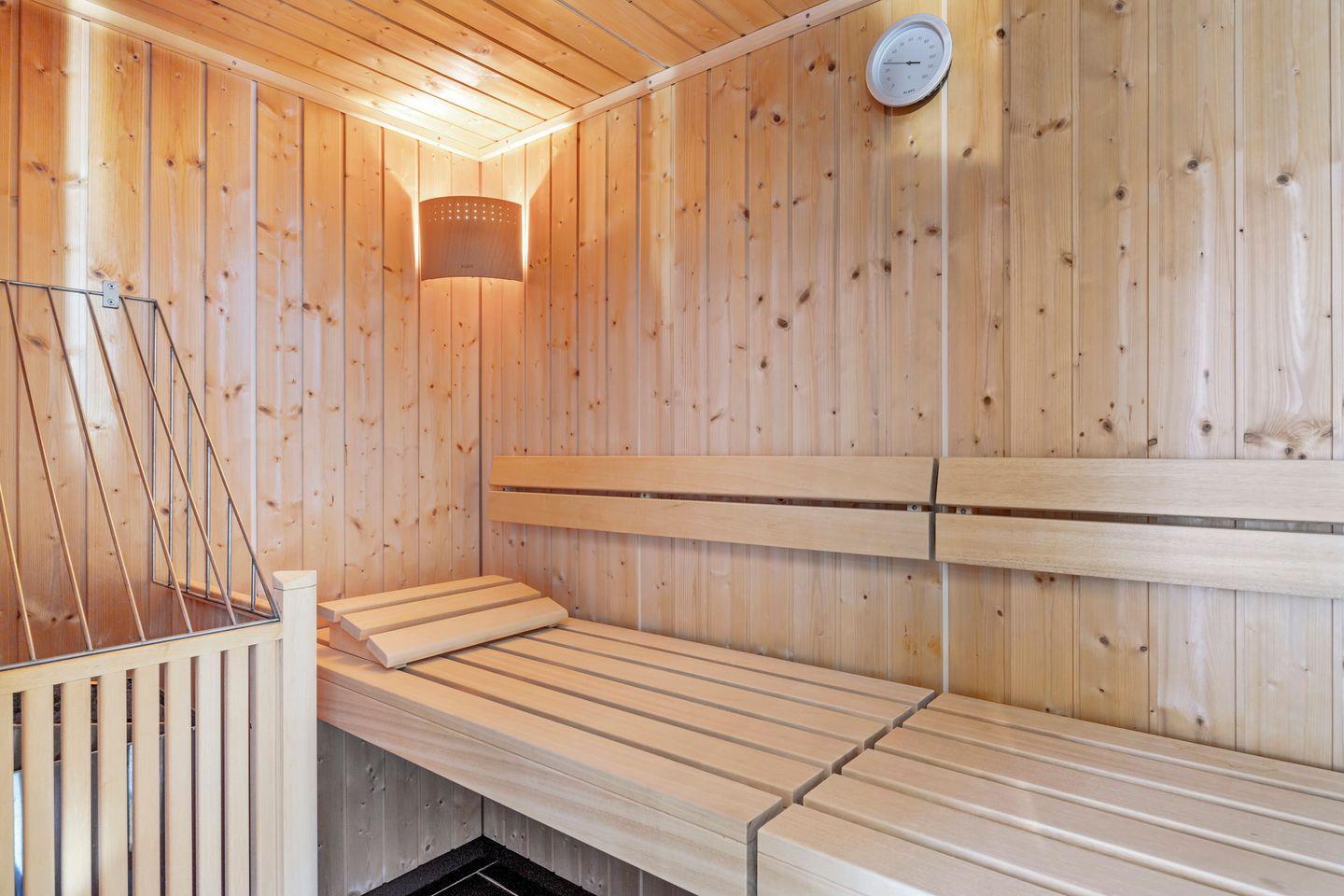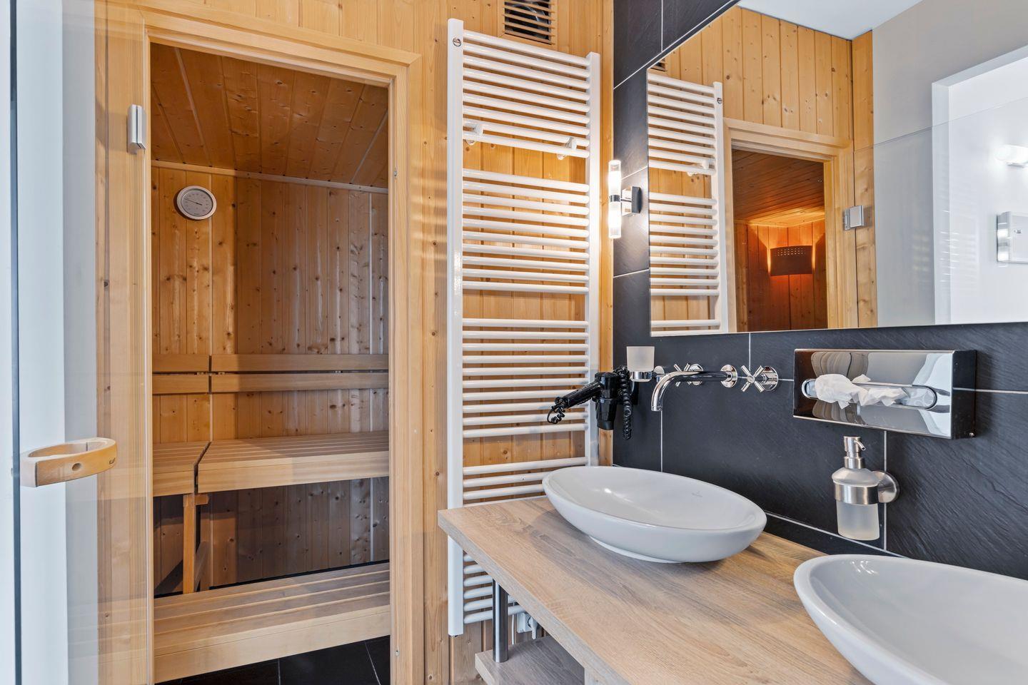 Im komfortablen Badezimmer mit begehbarer Dusche, Doppelwaschtisch, Föhn und Kosmetikspiegel befindet sich eine eigene Sauna zur vollkommenen Entspannung in privater Atmosphäre. Das Apartment verfügt außerdem über ein separates WC mit Bidet und Waschbecken, ein zweites TV-Gerät in einem der Schlafzimmer sowie über einen Bluetooth-Lautsprecher, Wecker, Bücher und Gesellschaftsspiele. Zwei sonnige Balkone mit Gartenmöbeln für vier Personen - begehbar vom Wohn- bzw. Schlafzimmer des Penthauses - machen das Urlaubsdomizil perfekt. Auf beiden Balkonen wartet jeweils ein gemütlicher Gartenmuschel-Sessel mit halbrundem Sonnendach auf euch – windgeschützt und perfekt zum Entspannen.