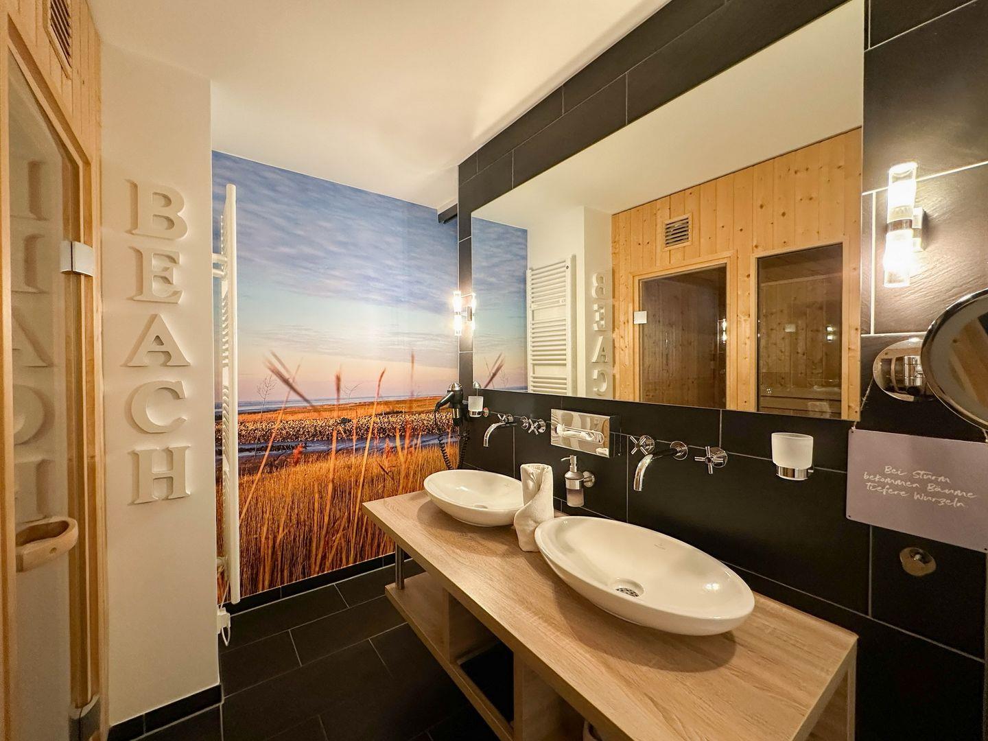 Das hochwertige Badezimmer ist eine richtige kleine Wohlfühloase - ausgestattet mit einem Doppelwaschtisch, begehbarer Regendusche, separatem WC, Bidet, Handtuchwärmer, Föhn und Kosmetikspiegel sowie der eigenen Sauna lässt sich hier wunderbar entspannen. Das Apartment verfügt über einen großzügigen, überdachten Balkon mit eigenem Strandkorb Gartenmöbeln und einem idyllischem Blick ins Umland und auf den Deich. Der sonnige Balkon ist vom Wohn- und Schlafzimmer aus begehbar.