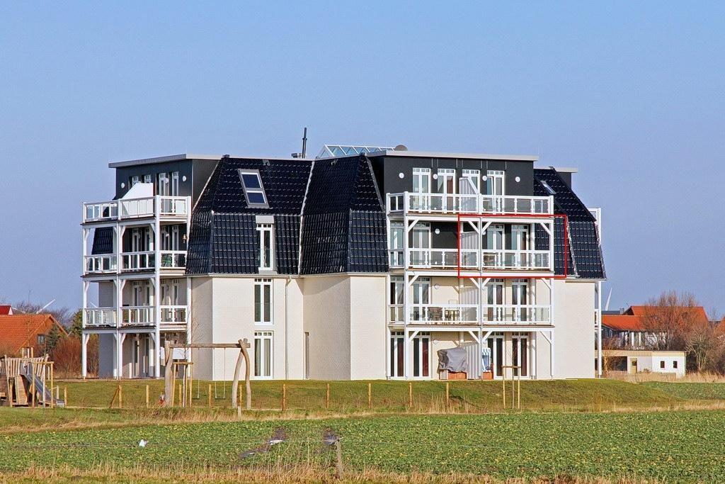 Die 70 m² große 3-Zimmer Ferienwohnung ist für bis zu 4 Personen geeignet. Besonders hervorzuheben ist die Sauna und der großzügige überdachte Balkon mit weitem Blick über die Felder, zum Meer und dem vorgelagerten Deich.